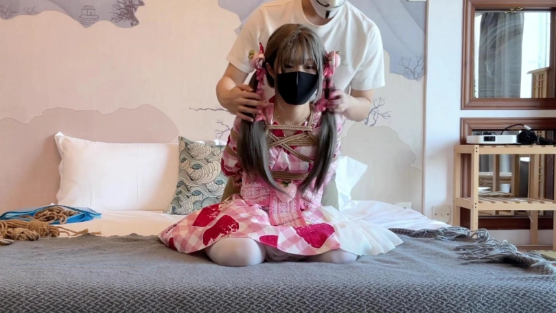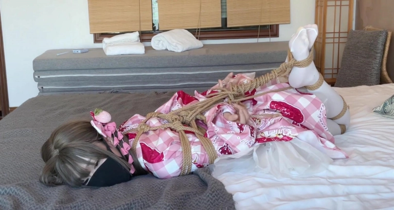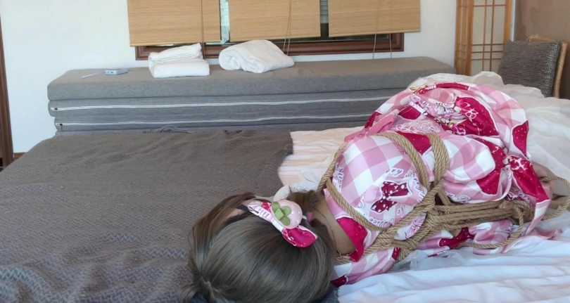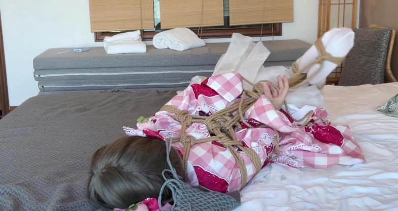 穿着美丽和服和白丝的女孩子杉原本是计划被绑起来后拍摄美美的照片,结果被紧紧绑成日式驷马紧缚后,被一个人留在了空空的房间里放置。女孩感受着身上麻绳的紧缚,努力挣扎,尝试挣脱,却始终无法逃脱,只能乖乖躺在床上等待被解救出来......