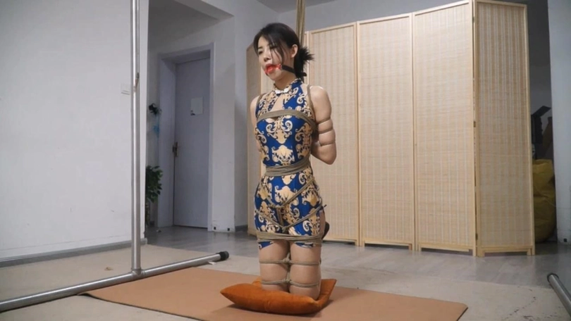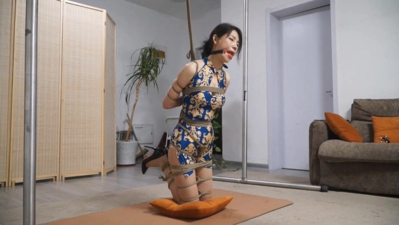 名模柳洋,紧身旗袍衬托着丰满的身材更加X感了。给柳洋绑上最紧的欧式直臂,双腿折叠膝盖顶地吊起来,这姿势难受极了。