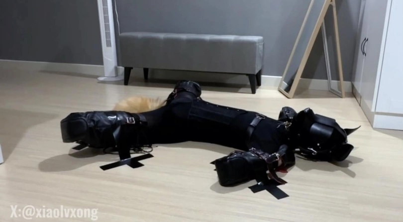 打完之后 用胶带把小狗大字固定在地板上 这个姿势看着轻松 其实久了还是有点难受的 先是放进小PJ 无奈小狗还没习惯 一直嗷嗷叫 过了一会感觉还是不太行 就先放过它了 下次再折磨 还是先拿它最喜欢的小粉棒棒让它舒服一下吧