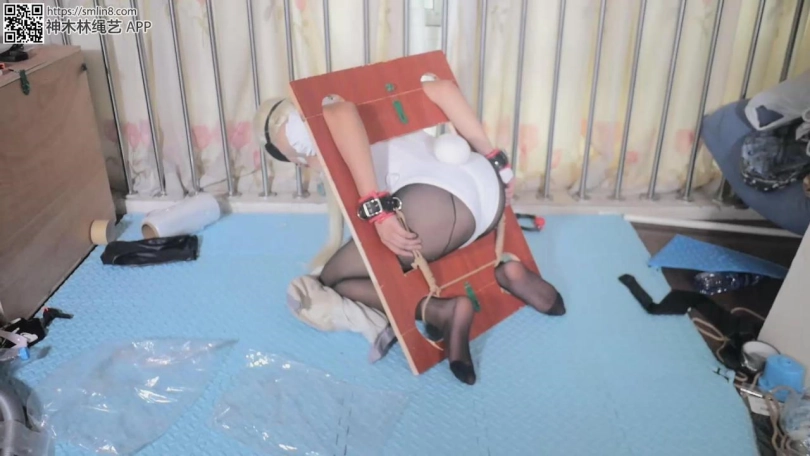 带着眼罩口球被拘束衣包裹着的兔女郎,双腿打开被固定在椅子上,等待她的不知道是客人怎样的玩弄
