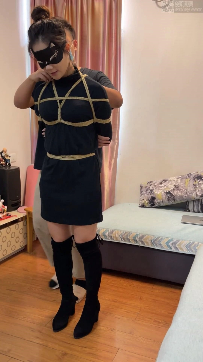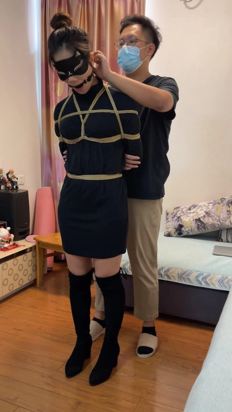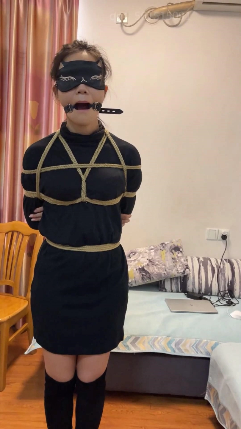 洋洋身着黑色套装肉色丝袜被日式捆绑戴口环调教,口水不争气的流出来,十分羞耻,后到户外体验镣铐押解,体验中被路过的车看到,紧张