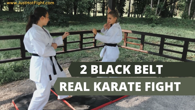 An intense karate fight between Olya and Lena, black belt vs black belt.