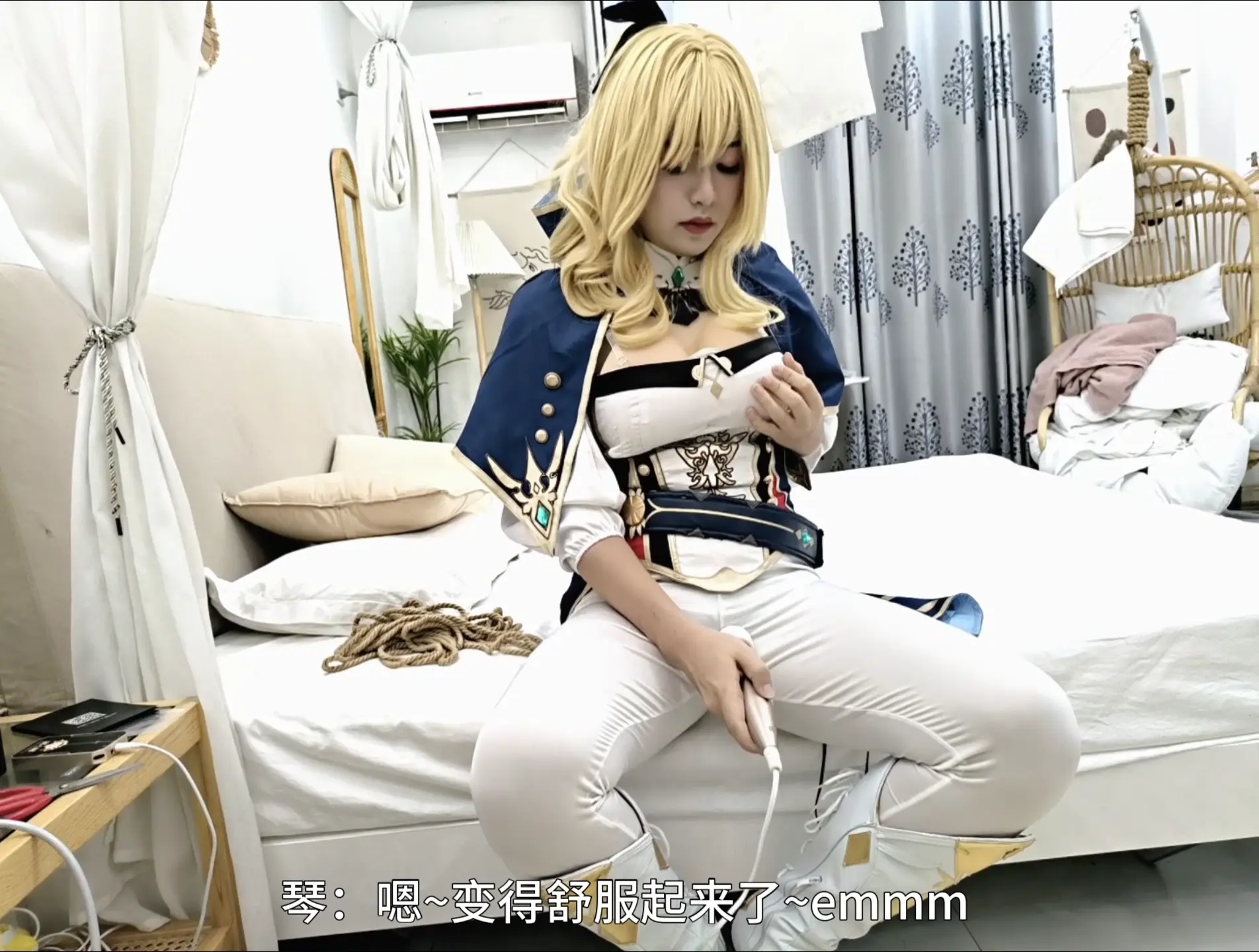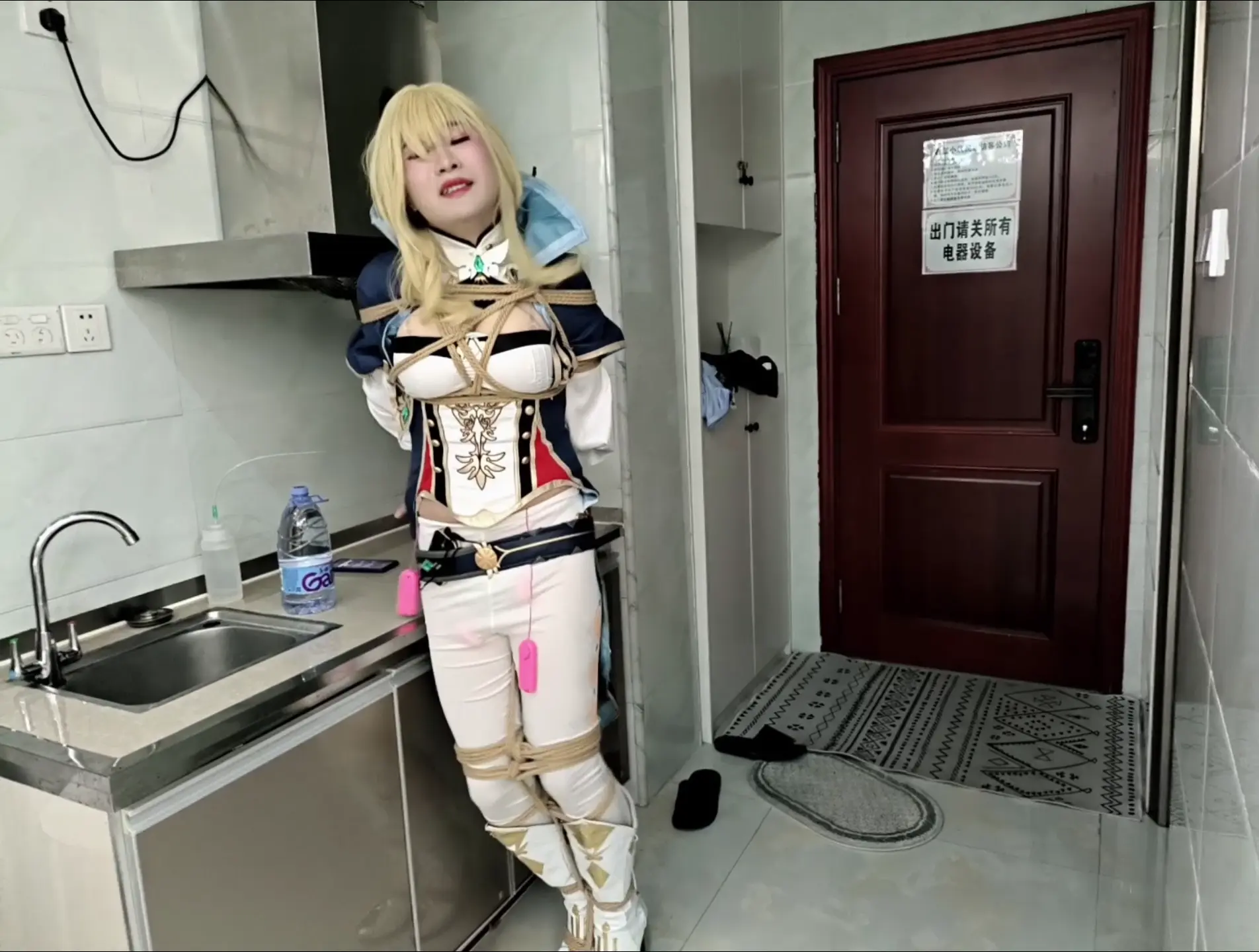 难得休假的琴团长,回到家中就开始了她的私密游戏。把自己捆起来,假装起被盗宝团绑架,随意蹂躏自己的身体,被[X_X]不停欺负敏感的地方。被郊狼随意欺负自己的屁股。结果在解缚的时候,还被旅行者空发现了。把解缚用的剪刀藏了起来,还把郊狼的电力设定成了随机数值最大的可能。为了摆脱郊狼痛苦的惩罚,琴团长只能在电力最小的时间段时尽快的找到剪刀解缚。可惜最终没能成功,落得一个失禁的下场。