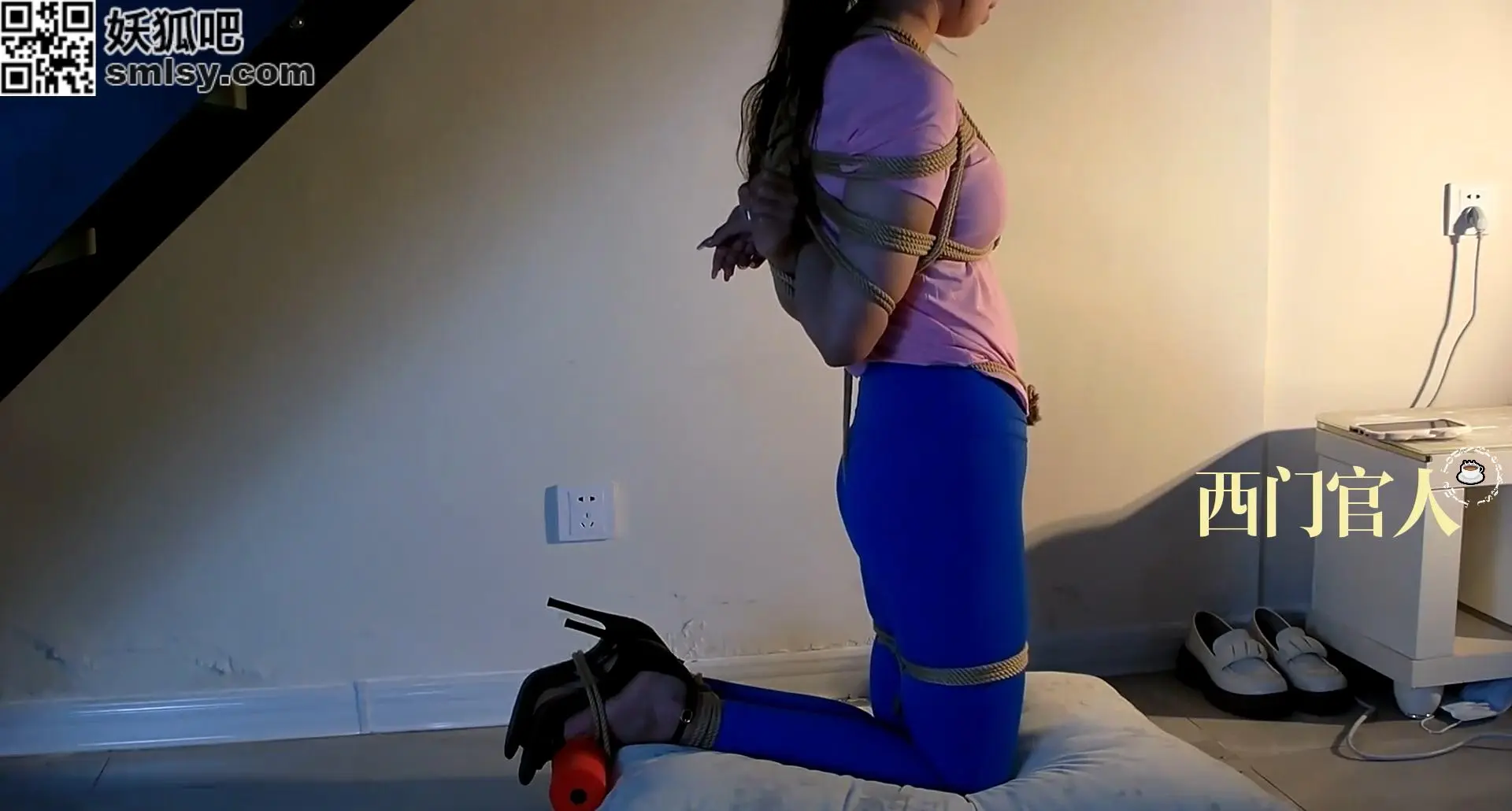 当绳子与楼梯间碰撞会发生什么样的摩擦,答案就是模特只能跪在地上,将绳子捆住上半身再穿过鲨鱼裤变成股绳与楼梯很好的融为一体吧,眼罩蒙眼加胶带封嘴,感受股绳的摩擦。