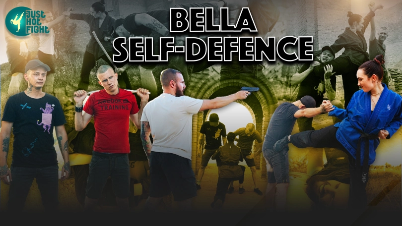 The video shows the different situations of the attack on Bella. She deflects attacks from one, two and three opponents using karate kicks and techniques. Each scene is shown from a different camera angle.