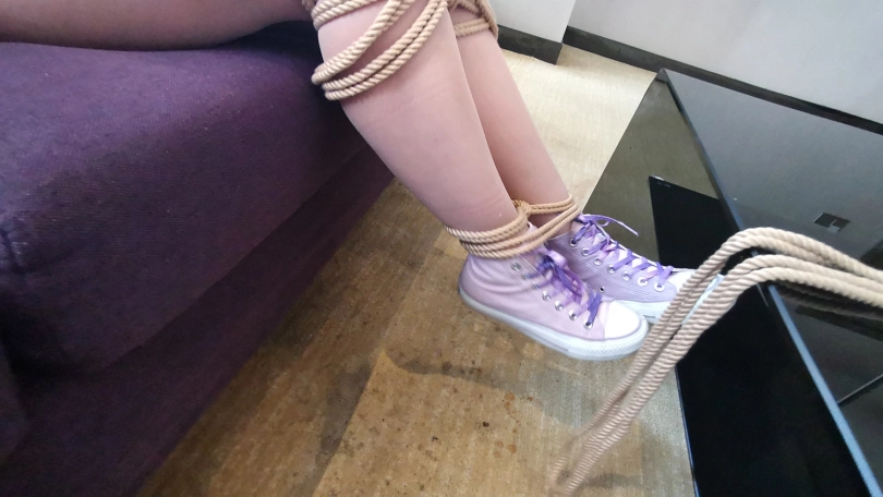 新人琳洛,90后妹子一枚,对捆绑很好奇感兴趣过来体验。全身捆绑后让其在房间里像兔子一样蹦跳,妹子也挺实在,蹦的频率这个快,不一会就气喘吁吁。让她坐在沙发上休息,自己试着挣脱脚上的束缚,双脚不断挣扎,脚上的绳子居然松动了,辛亏她穿的鞋子鞋带系的比较紧,鞋子自己脱不下来,不然真的会挣脱开来。妹子还是比较面腼腆,有些放不开,慢慢来吧。