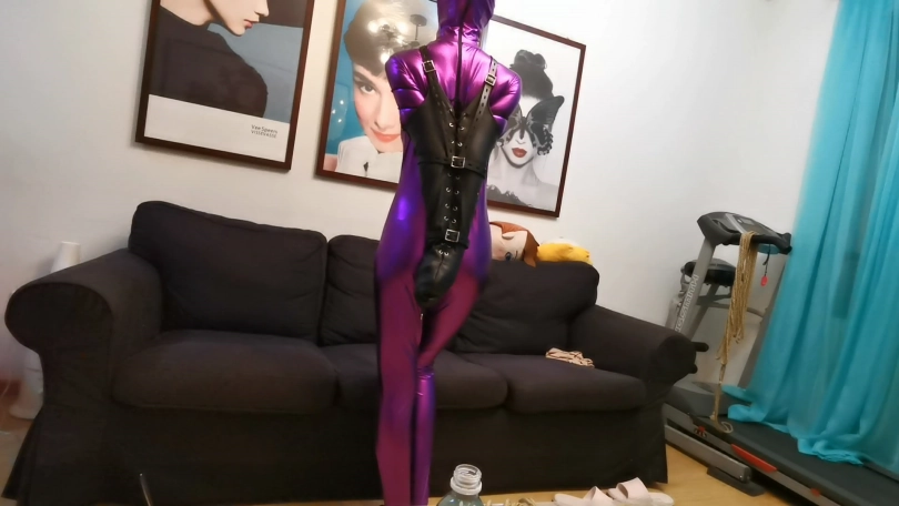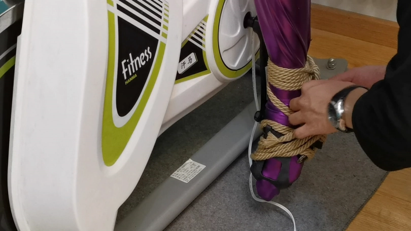 这次让凌薇穿上件紫色胶衣,并用单手套束缚住,嘴里带上马具钢球口塞,下面用束缚带绑着棒子强制刺激。随后将其固定在单车上,一边忍受着下面棒子猛烈刺激,一边不能停下来骑行单车。强制刺激下GC起伏不断。。。