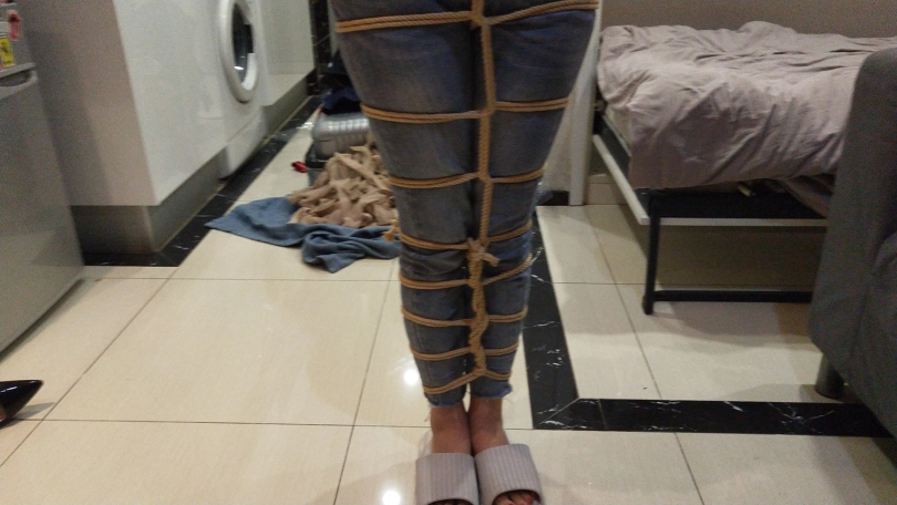小冷:牛仔裤,休闲装,全身被绳子紧紧束缚,嘴里塞着口球;