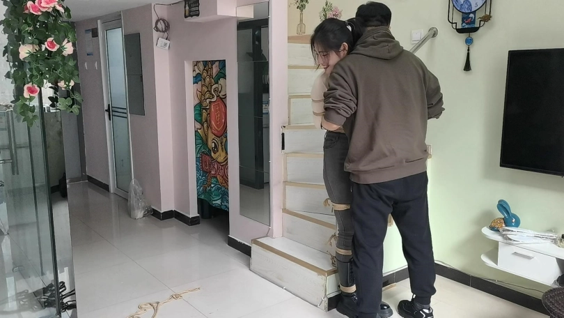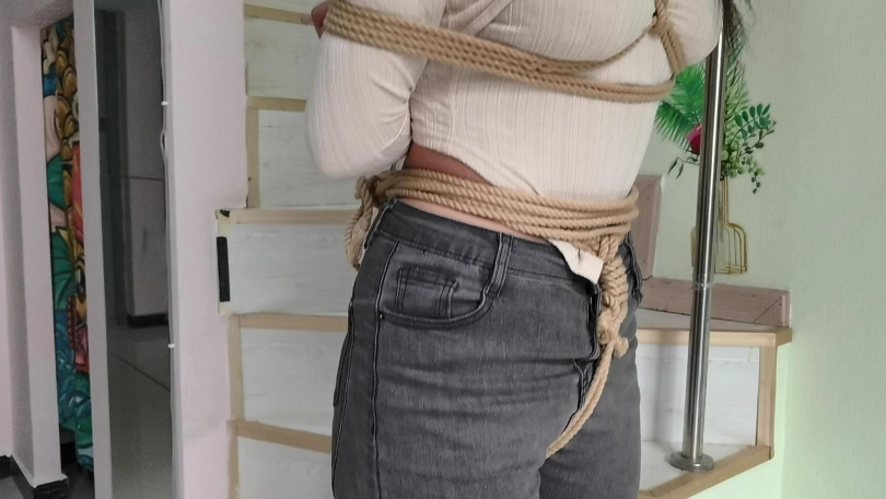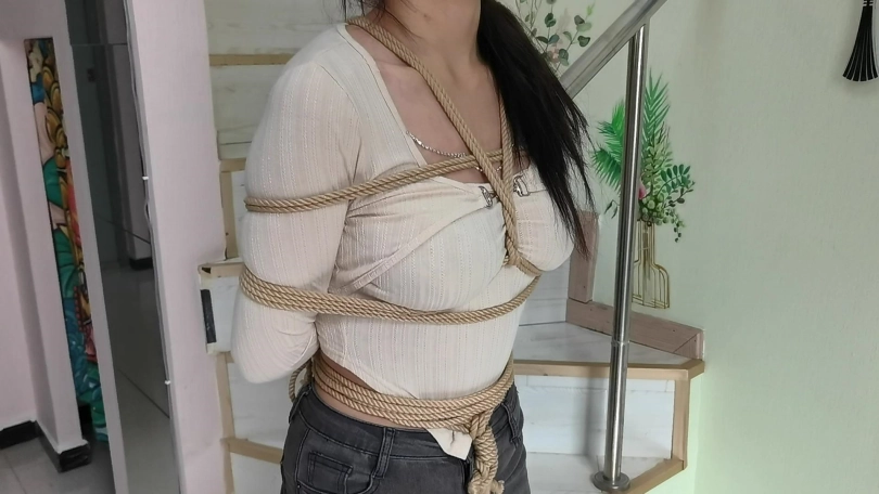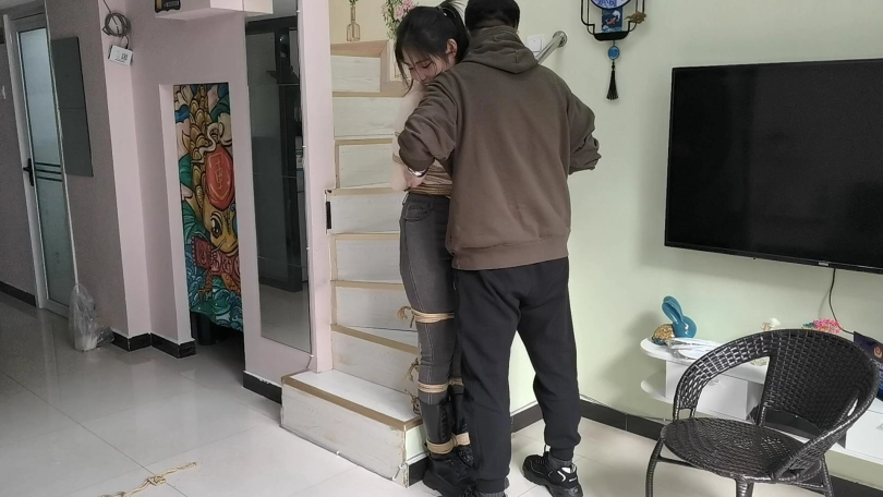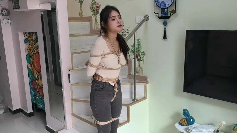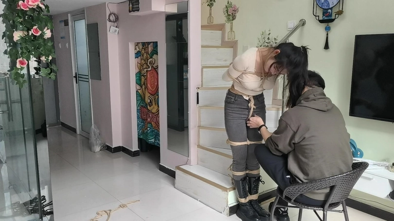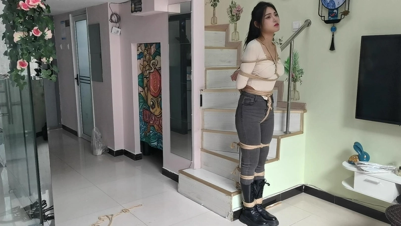 她穿者黑色长靴,上半身日式捆绑,股绳,把她绑在栏杆上固定。然后让她体验挠痒。。。