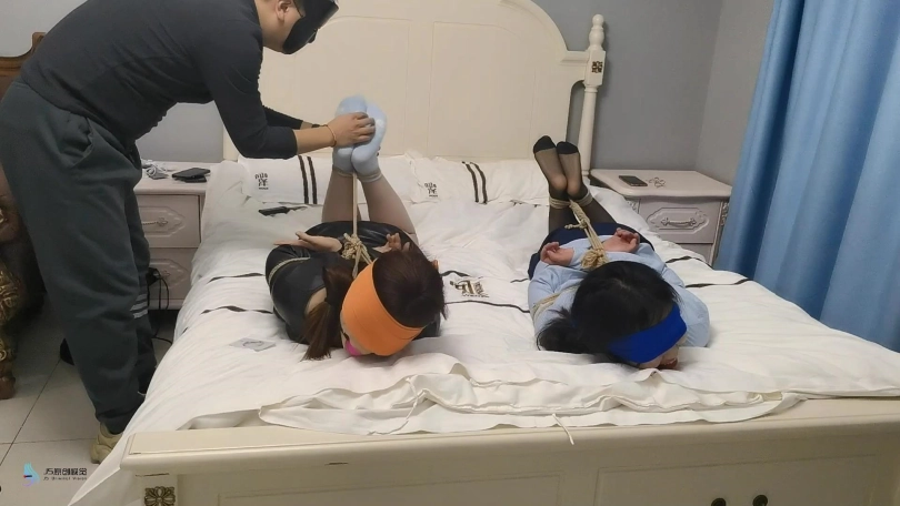 两名女孩回家,脱鞋[X_X]玩弄手机,玩累的她们睡了过去。这时一名歹徒闯进来,将两人捆绑起来。眼镜也给蒙上,嘴里都塞着口球。歹徒找到了一张银行卡,逼问密码。妹子不说,开始挠她们的脚底。歹徒得到密码后扬长而去。两个妹子不断的挣扎,最终挣脱束缚报警。