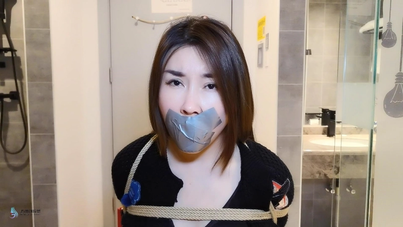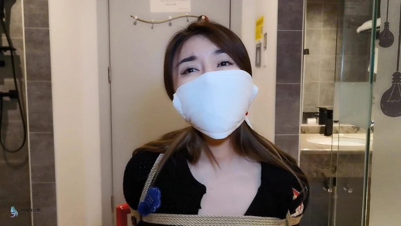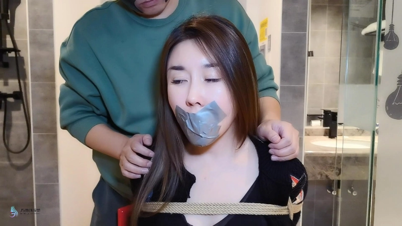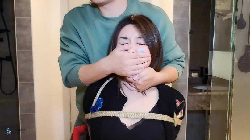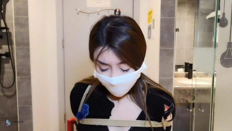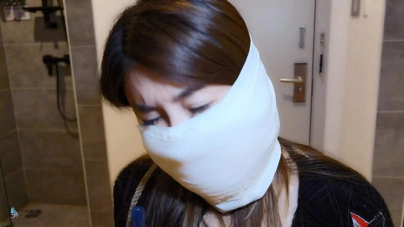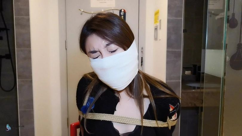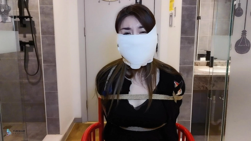 把艾菲绑在椅子上,先用丝袜堵嘴,外面用胶带封嘴。捂住她的口鼻限制呼吸。戴上口罩,然后外面在缠绕绷带。艾菲呼吸很困难,不断的在椅子上呜呜挣扎。。。