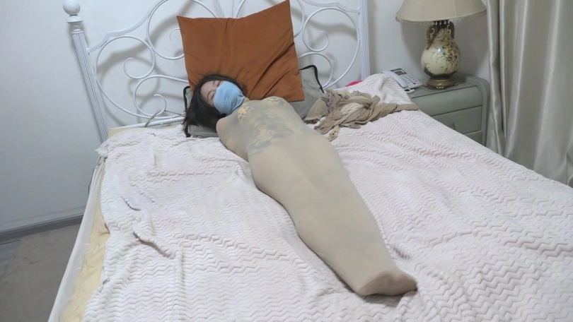 被放置在床上挣扎的晓蕾,套着丝袜的双手无法活动,