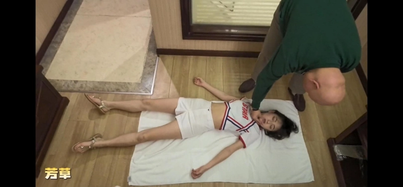 胖子是酒店经理,查房时候发现一个短发美女躺在地上失去意识,胖子男色心大起,开始摆弄女主身体,尽情玩弄后离去。涉及元素有昏迷、摆弄、翻眼皮、裸足等。