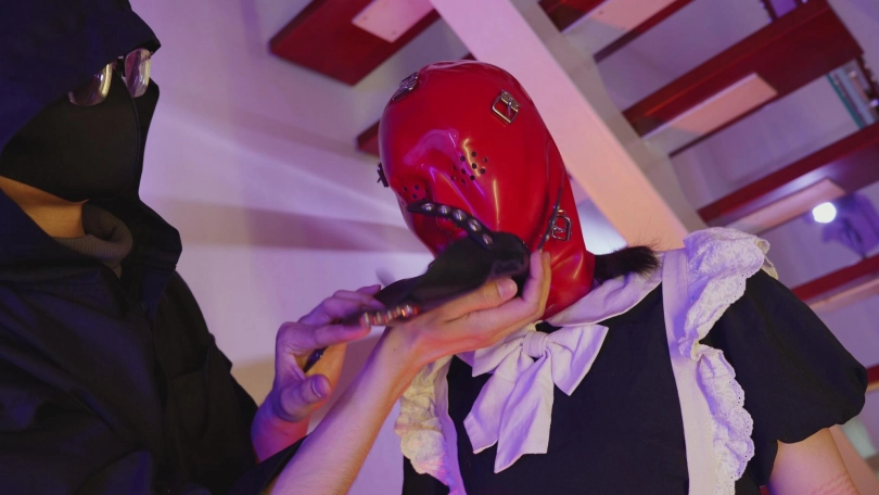 这才刚刚开始,被强行戴上了乳胶头套剥夺视觉听觉,面具内含口球填满口腔无法说话,苦闷口水不断在面具里积累,绑在柱子上拷问,只能