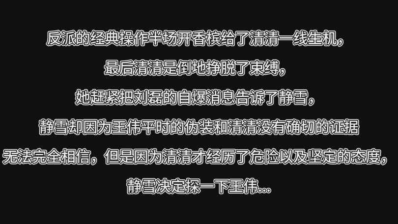 最后清清是倒地挣脱了束缚,她赶紧把刘磊的自爆消息告诉了静雪,