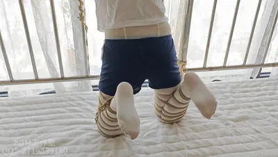 将梦梦折腿绑好,让她用膝盖走路,看到白丝小脚忍不住就想挠她脚心,真可爱!然后折腿直立绑到飘窗的栏杆上,小脚在不停的抖动,像个快乐的小鸟一样,可以看动图,中间还有好多类似的动作。