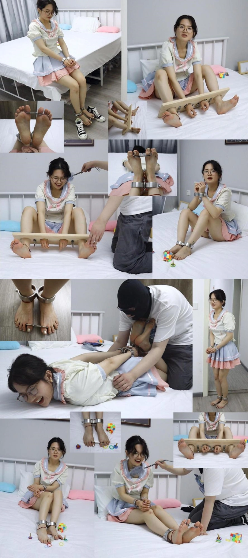 本片是很经典的被“抓包”剧情,妹子在家中自己玩8字手铐,结果钥匙在客厅,自己走不过去,只好拜托室友给拿一下,于是被室友发现了哈哈哈,钥匙收走被锁起来挠痒痒,驷马铐起来,最终被一字枷锁住,动弹不得,只好露出两只可爱的脚底板哈哈哈!!!