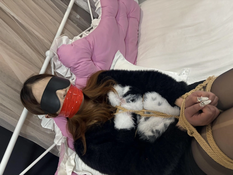 曾在英国留学的大学生小宁首次体验绳艺,微胖女孩,黑丝+手脚并缚+吊脚+胶带封嘴