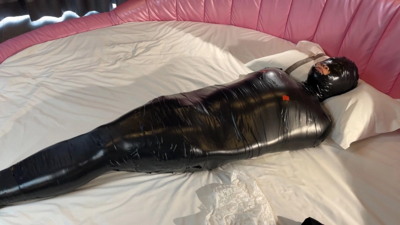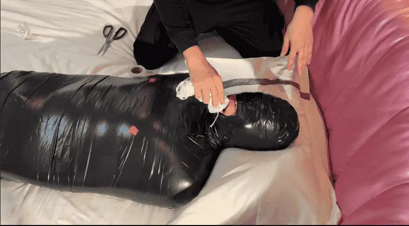 这是最幸运的小m。体验胶带木乃伊 除了正常的刺激榨汁外 还有一整条超性感的蕾丝内内塞到嘴里 内裤实在有点大 需要用胶带辅助固定 被这么性感的原味内裤堵住嘴应该很幸福吧!(女朋友每次都是穿破的丝袜不要了给我堵嘴用 这次居然是一条蕾丝内裤。)