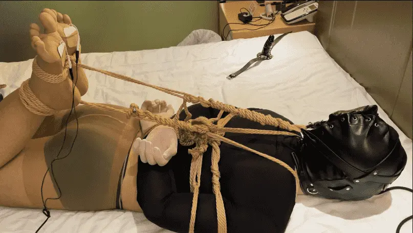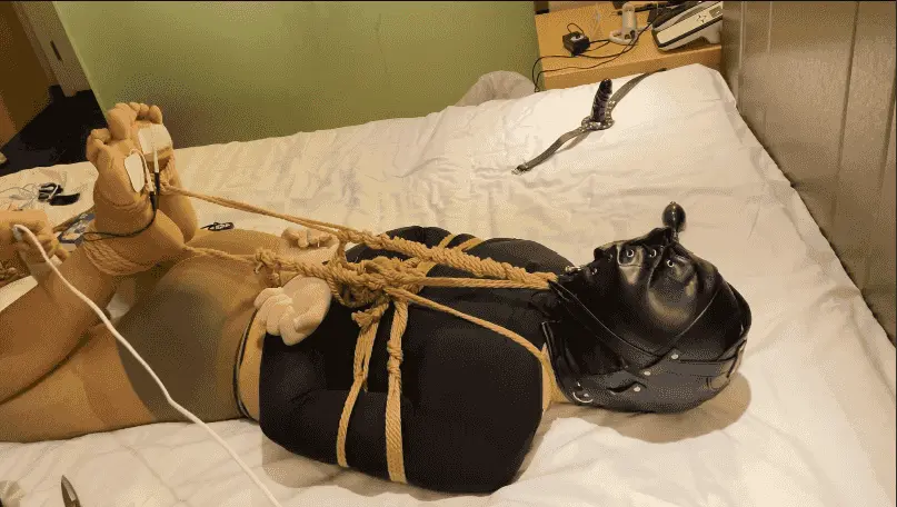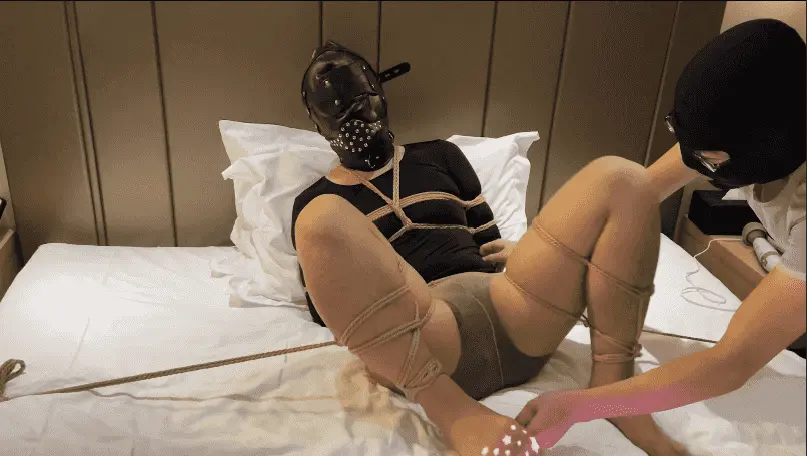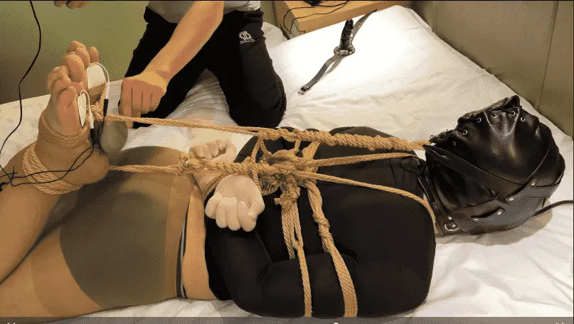 小M想体验绳子与挠痒 日式捆绑上半身 M字开腿固定下半身 无法反抗的被挠脚底 然后换驷马捆绑 两脚完全暴露出来 丝袜被撕开 贴上两个电击贴片 电击和挠痒双刺激 充气口塞塞满口腔 让他叫也叫不出来
