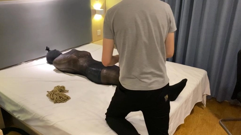 体验拘束的老哥 保鲜膜缠绕全身然后人袜从脚包到头顶打结 最后红绳缠身 AV棒子固定强制榨精