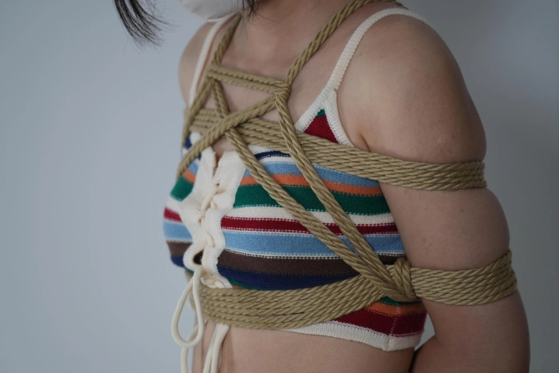 筱筱刚还在美美的自拍,下一秒双腿就被固定在的凳子上,脖子也被小狗项圈吊着,手脚被铐子拷起来,用铁链连接,一弯腰脖子就被拽的生疼,还没反应过来,灰太狼就拉着筱筱做游戏,刚开始筱筱非常卖力,但灰太狼耍赖无论回答正确还是错误都逃不过惩罚,脚心,胳肢窝等各部位被各种工具挠了个遍。还不罢休的灰太狼又用绳子在她身上捆绑,胸缚+双腿折缚+团缚一系列捆绑,让筱筱的皮肤上留下道道红印,重心不稳的她从一边倒下,连穿的内裤都被暴露在外面,虽然来回扭动挣扎着,但依旧逃不掉一番折磨