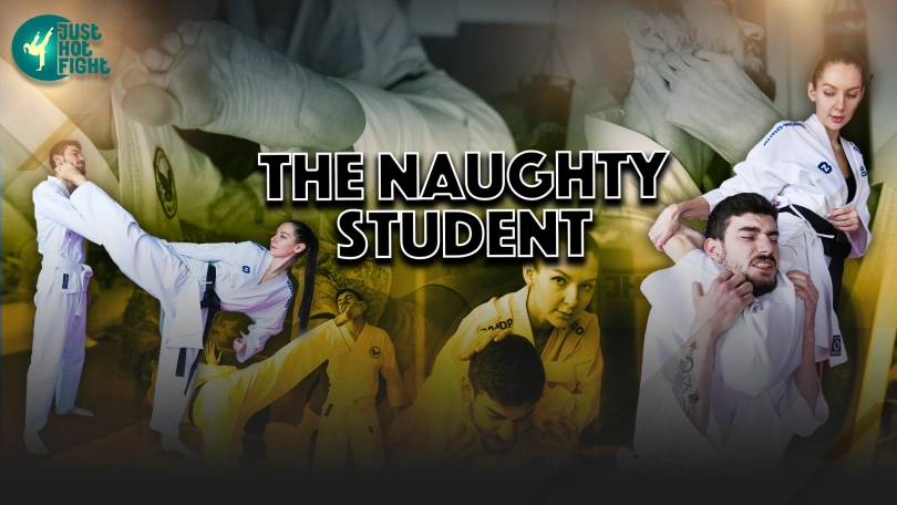 Kate was visited by a naughty student who didn`t do well in training. Kate had to punish him with her powerful leg kicks.