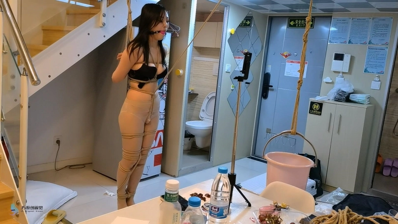 哈妮突破尺度的作品,只穿内衣哈妮的好身材一览无余,内裤里零距离内置TD,日式后高手跪缚在楼梯间放置,然后又把哈妮直立吊起来,股绳另一端吊一个装了水的水桶,股绳紧紧的压着TD不停地刺激着哈妮。