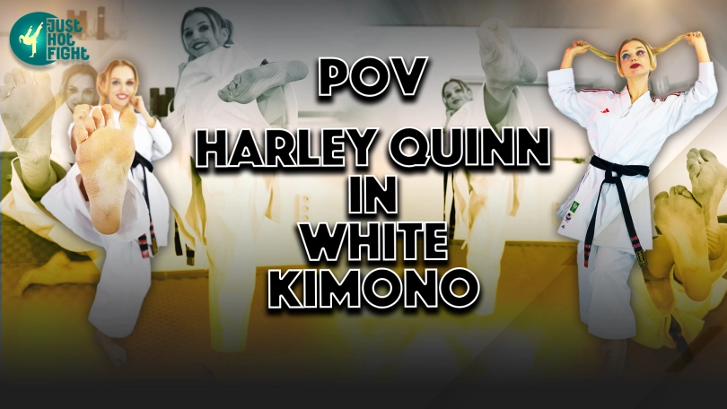 Lethal BLonde in a White Kimono as Harley Quinn strikes directly into the camera, showing off her incredible footwork.
