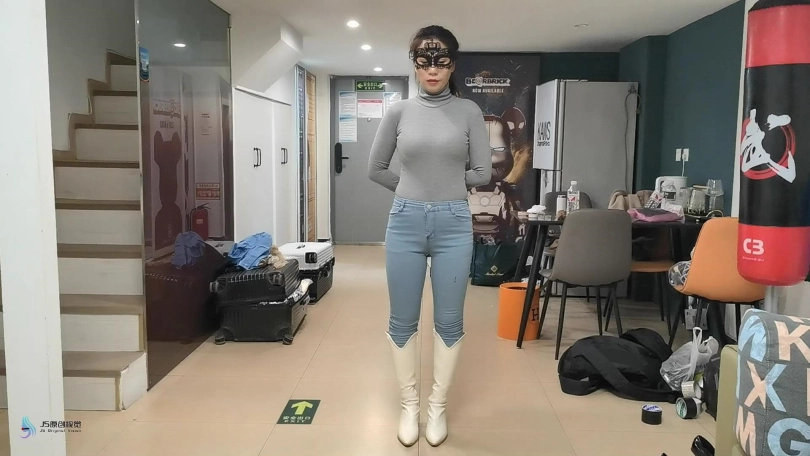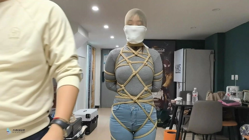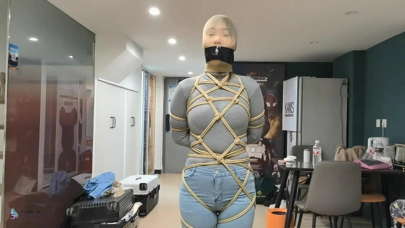 女人身穿牛仔裤和奶白色牛仔靴,用绳子将她全身密集的捆绑起来。嘴里塞着丝袜,在用丝袜头[X_X]在她头上,再用胶带缠绕她嘴巴,防止她吐出嘴里的丝袜。再给她戴上一个口罩,这样能限制她发出的声音。将她绑在柱子上固定好。开始抚摸她的胸部和裆部挑逗她,看火候差不多了,脱下点她的裤子,露出裆部,分别用两个棒棒轮着刺激着她的裆部,很快女人就释放,发出享受的呜呜声。