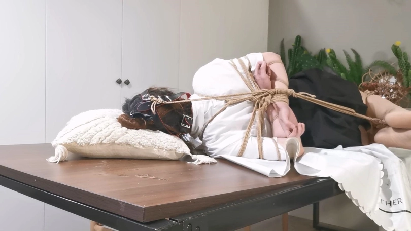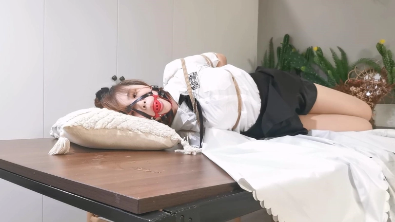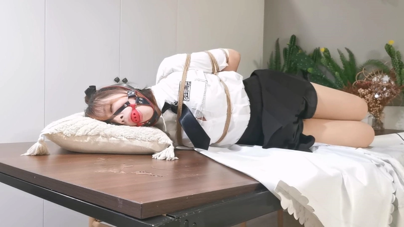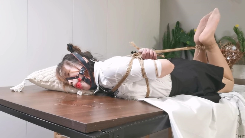 还是JK制服,这次绑的是中式五花,驷马放置在桌子上,并用马具口球堵嘴,还用绳子把口球拉紧,最后玥妍的口水流的桌子上到处都是。