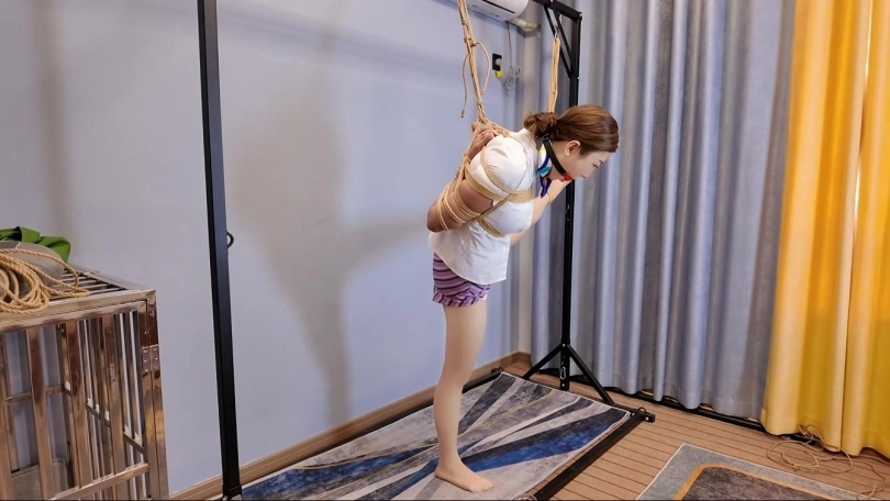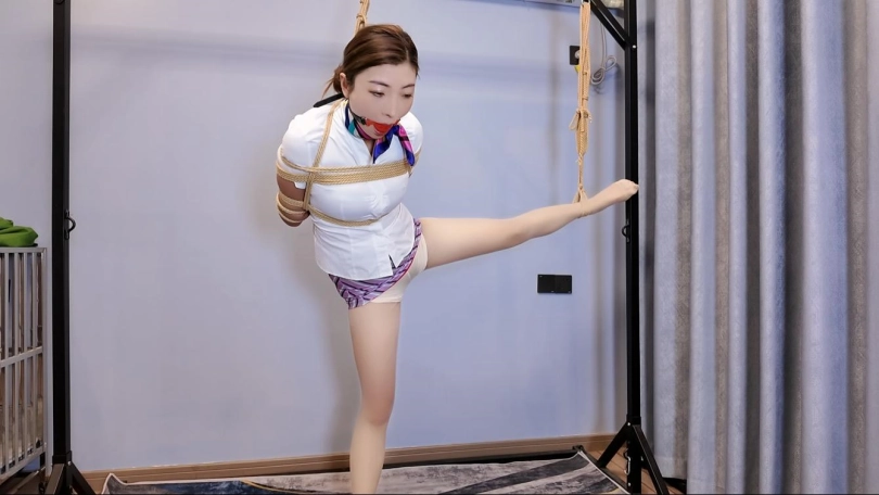 后手观音是佳佳长项,但是后手观音在吊起来一只腿,并且带上口塞,半小时不许摘,这是个挑战,还请拭目以待吧