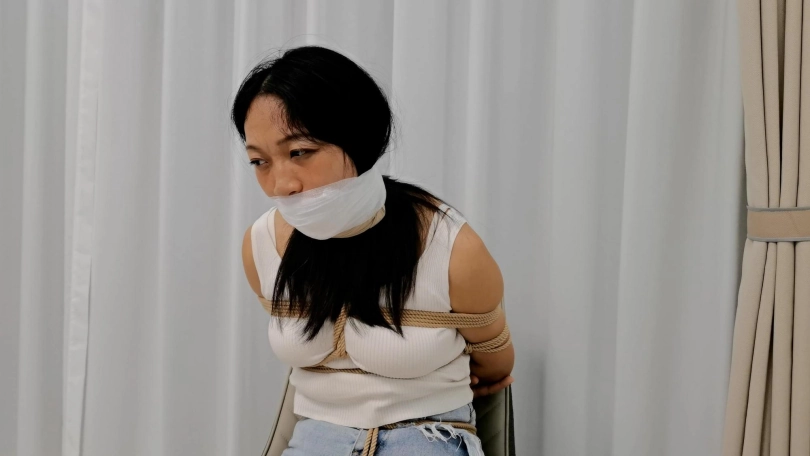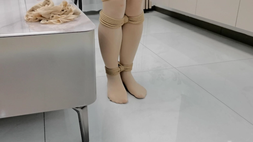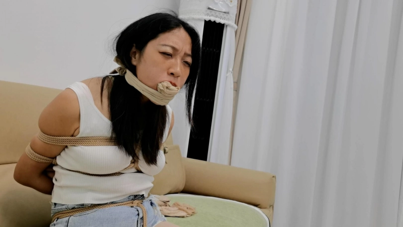 4、丝袜堵嘴+自粘绷带封嘴,本来想追求最严厉的封嘴来着,不过泡棉胶带刚好用完了,只能退而求其次用自粘绷带了,不过效果还不错,这个想挣脱也是难如登天。
