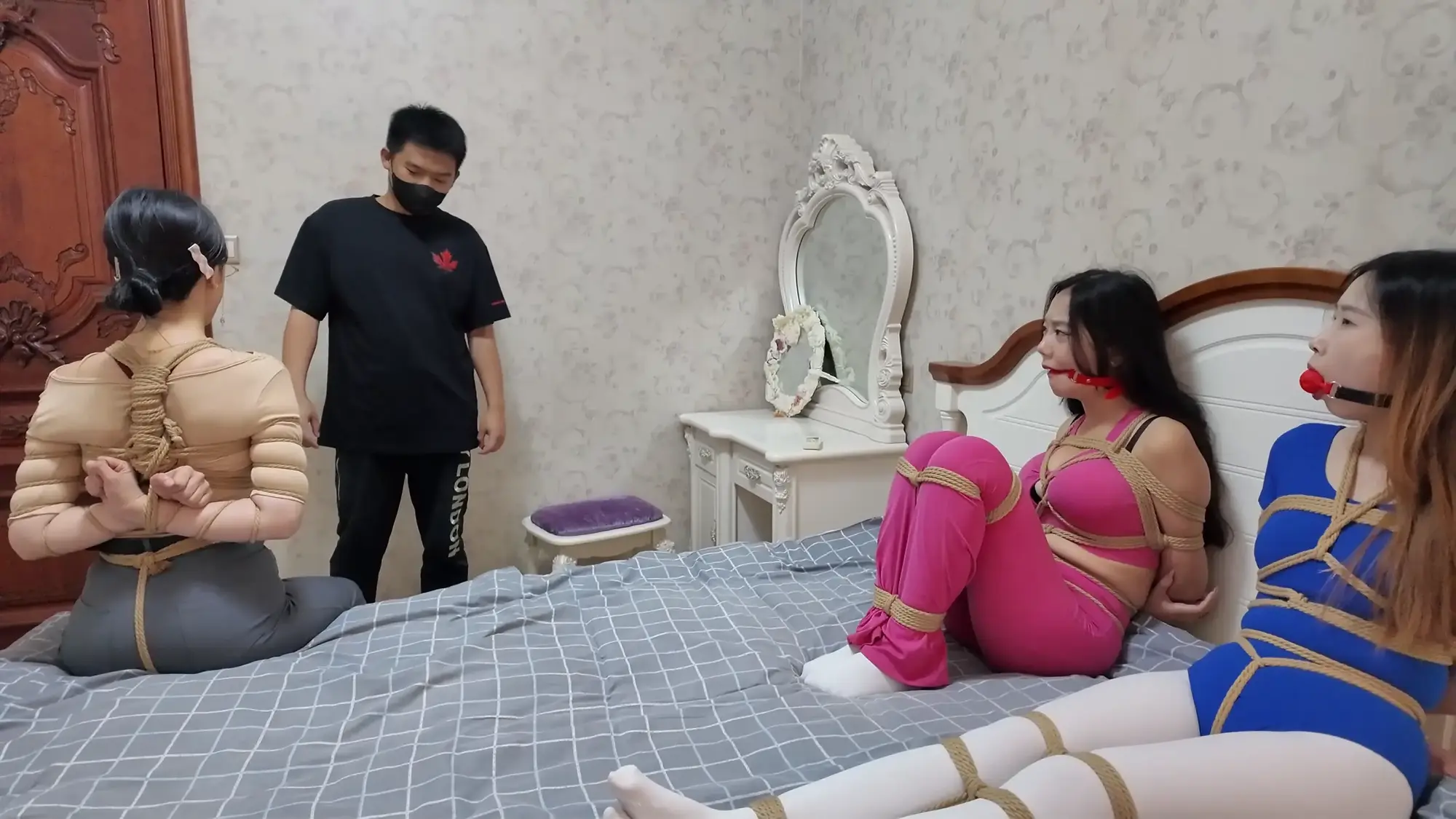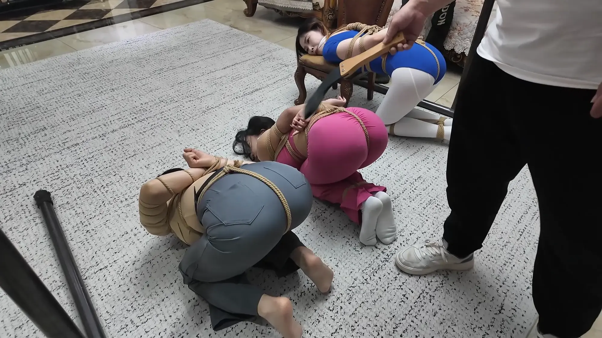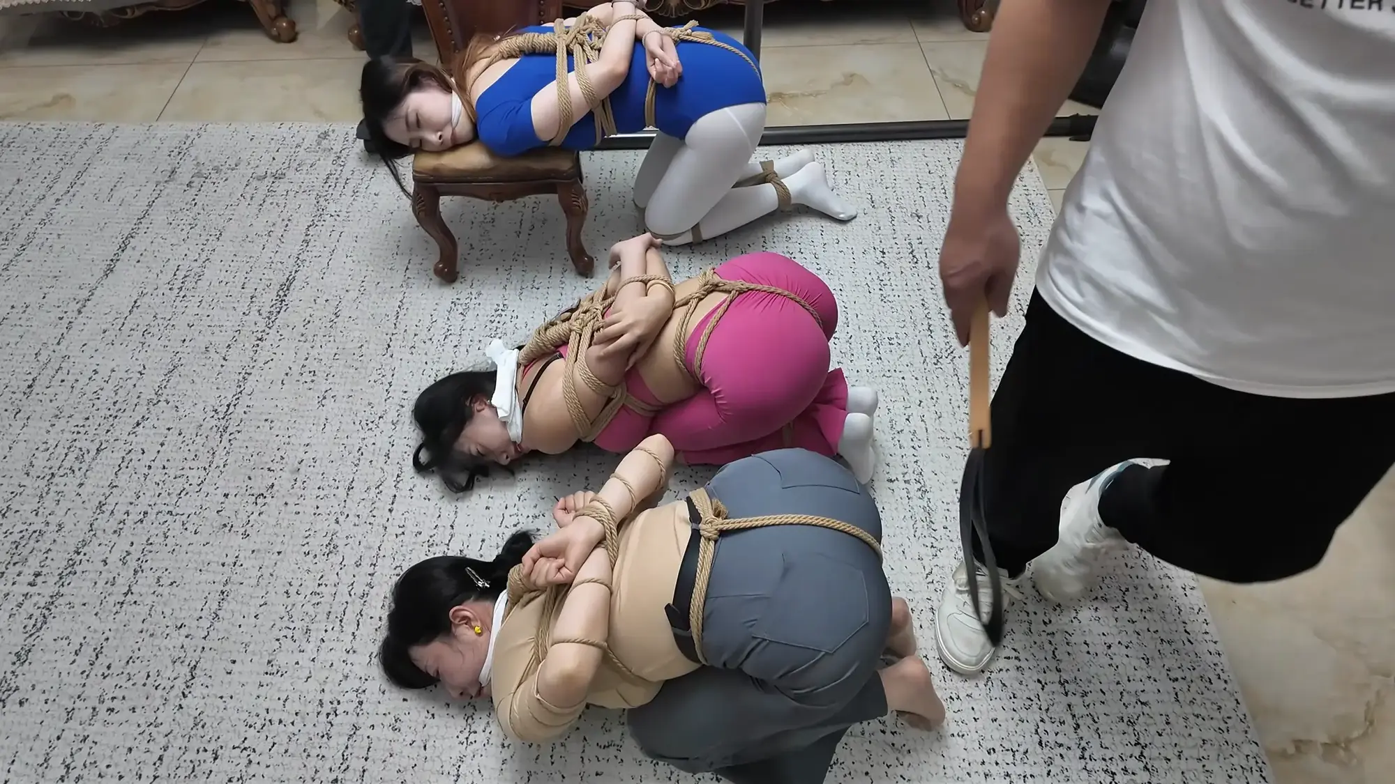 【视频时长】:00:39:08 【文件大小】:2404MB 米粒和佳雯对剧本的理解都很精准,完全代入了角色,尤其是米粒扮演的e小姐,笑面虎和媚女的形象切换演绎的淋漓尽致,佳雯则是稳定发挥,把本系列中雷姐角色泼妇毒蛇的形象塑造的极为形象,南清虽然演技上不如前两位,但进步也是肉眼可见的,尤其是说台词和敢直视镜头这两个方面,希望再接再厉。 前情提要,南清探员逃跑失败,再次被雷姐的手下抓住,雷姐也被自己的手下背叛。此后,南清与雷姐被囚禁起来,两人分别被换上体操服与瑜伽服遭受折磨。某一日,南清被单腿吊缚,雷姐则是头戴马具,嘴塞口球,m字开腿坐在椅子上,两人照常被两个男人玩弄,小弟表示马上就要把她们卖掉有些舍不得,大哥告诉他自己准备黑吃黑,钱和人自己都要,并说利益最大化是雷姐教给自己的,看到雷姐依旧瞪着自己不肯屈服,大哥开始用力锤击雷姐的腹部,并拉扯雷姐的股绳教训她,一旁的南清也一样不服气,被拿掉口球后依旧放狠话要杀了他们,两个男人大笑嘲讽,小弟拿起鞭子开始教训南清。过了一会儿,大哥的手机发来买家的短信,他命令小弟把南清和雷姐捂晕关到卧室里,一切准备妥当后,大哥让小弟下去接人,自己做好偷袭的准备。 画面一转,e小姐出场(米粒扮演),她提着箱子边走边接起电话,电话另一边的老大命令e小姐拿到获取后就把卖家干掉,e小姐轻蔑一下说一定完成任务。e小姐与小弟会面,被小弟带上了楼。刚刚走进屋子,e小姐就察觉到了不对劲,并让躲在角落里的人出来。随后大哥拿着枪走了出来,夸奖e小姐是个狠角色并且还是个大美人,e小姐表示他们胆子不小敢黑吃黑,并告诉他们如果让自己的老大知道他们怎么死的都不知道。小弟不耐烦的让e小姐放下箱子,双手背后站在一边。e小姐淡定自若的照做,并用充满挑逗的口气说不开枪杀了自己,摆这个姿势是不是要绑。小弟验完钱后大哥回应e小姐本来是准备一枪干掉她的,但实在舍不得杀掉眼前的大美人,于是大哥命令小弟拿绳子去,将e小姐紧密捆绑了起来(捆绑过程全记录),捆绑的过程中e小姐不停挑逗眼前的两个男人,把两个人迷惑的神魂颠倒,但为了保险起见,大哥先让小弟把米粒关起来,慢慢料理她。 e小姐被带到了关押南清雷姐的房间,小弟拿掉南清雷姐的口球让她们聊聊天,雷姐刚被摘掉口球就开始痛骂,被小弟教训了之后暂时老实了下来,坐在一旁的e小姐嘲讽雷姐被自己的手下背叛滋味不好受吧,雷姐惊讶的问她怎么知道这些的,而思维敏捷的南清直接猜出了e小姐的身份,并问她是不是被黑吃黑了,e小姐起身夸奖南清,并疑问南探员这么厉害的角色是怎么被抓到的,而南清则是反嘲她又是怎么被抓到的,e小姐一脸妩媚的弯腰凑近南清说都是为了得到南清才亲自出马的,结果被南清呵斥骂开,一旁的雷姐嘲笑e小姐只会嘴硬,还夸南清骂的好。e小姐突然变脸一脚踩在了雷姐的腹部上,辱骂她丢了同僚的脸,雷姐也不甘示弱骂了回去,南清则是在一旁劝架。听到吵闹声的两个男人跑了进来,拉开了e小姐。e小姐又突然变脸,一脸娇羞对着两个男人撒娇,并请求能不能把绳子松一松,看到这个情景的雷姐和南清都露出了不可思议的表情,辱骂e小姐不要脸。大哥表示既然她们三个都火气这么大,就帮他们泄泄火,南清雷姐e小姐被布条勒嘴带出了房间,站在一起的雷姐与e小姐依旧互不相让,用身体撞对方,被大哥拉开。三人被强制按倒在地用皮鞭抽打... 结尾下集预告,雷姐被脱掉外衣,内衣捆绑;e小姐挣脱束缚对峙面具男被石头击落手中的手枪;e小姐南清雷姐再次被捆绑起来,被神秘人拉着绳子带走。 ![]() ![]() ![]() ![]() ![]() ![]() ![]() ![]() ![]() ![]() ![]() ![]() ![]() ![]() ![]() ![]() ![]() ![]() ![]() ![]() ![]() ![]() ![]() ![]() ![]() ![]() ![]() ![]() ![]() ![]() ![]() ![]() ![]() ![]() ![]() ![]() ![]() ![]() ![]() ![]() ![]() ![]() ![]() ![]() ![]()