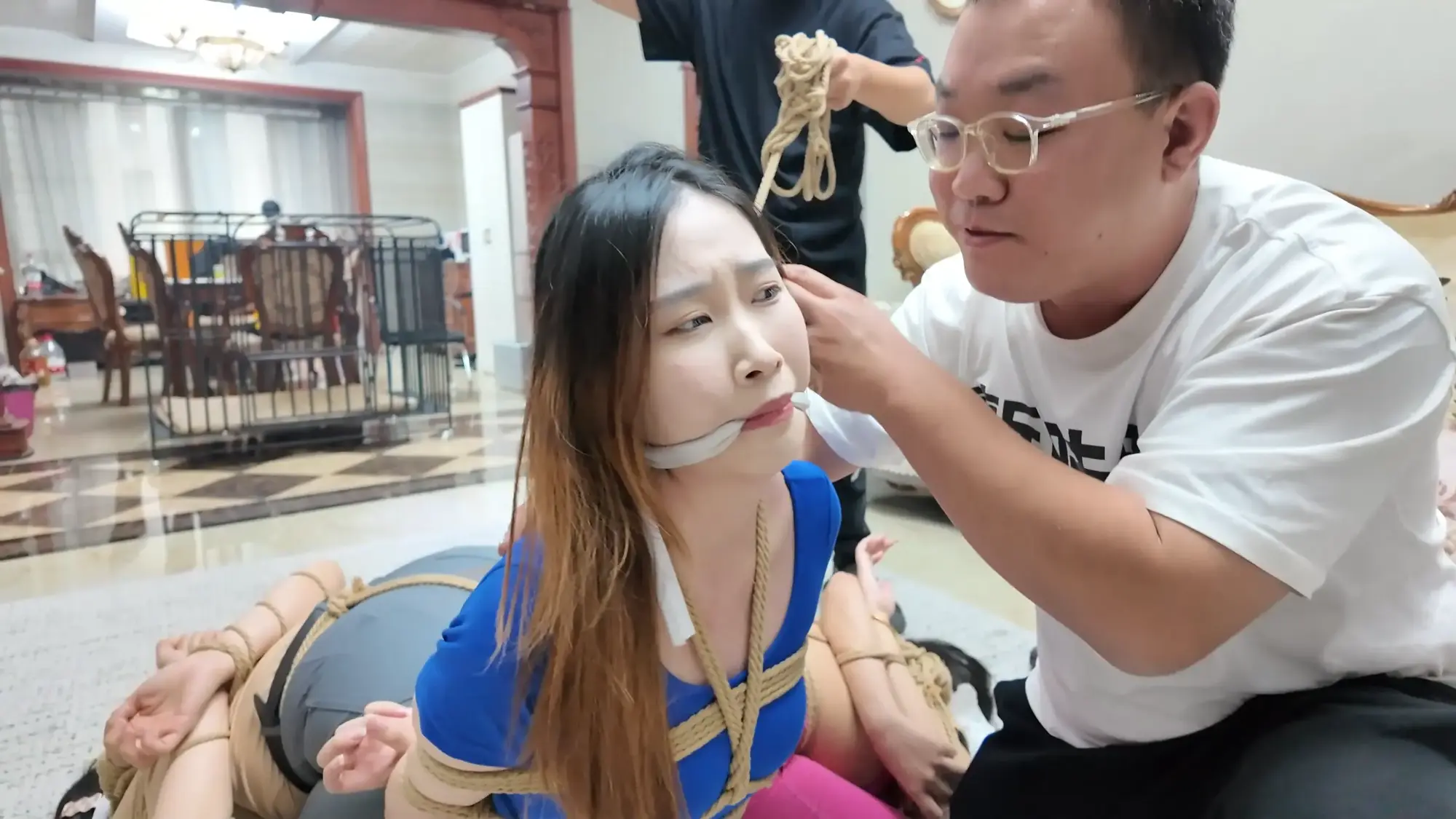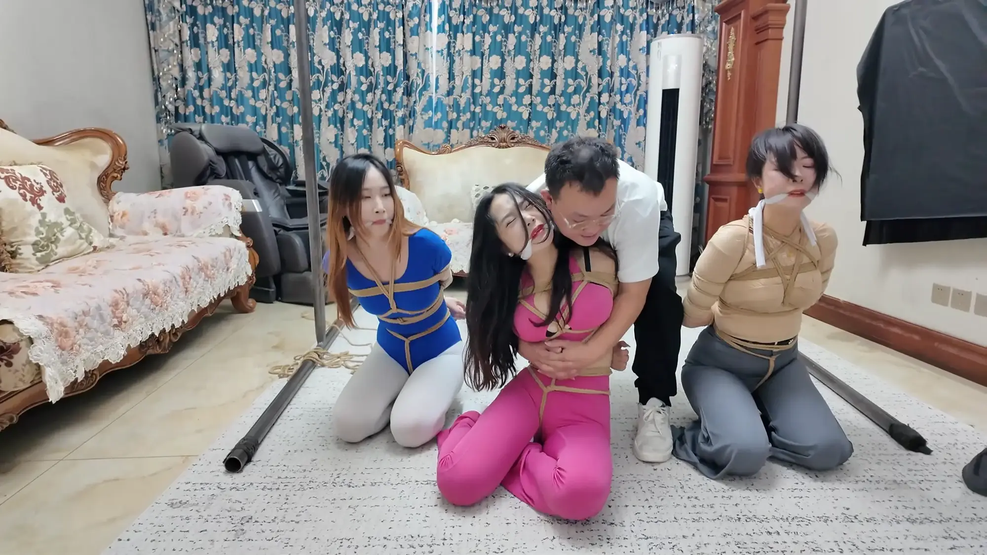 画面一转,被绑好的e小姐被丢在了沙发上,此时三个女人都被丝袜塞嘴,嘴上还被勒着一圈绳子,三人被神秘人一番玩弄后,脖子被绳子绑好连在一起,被神秘人拉着走向大门...