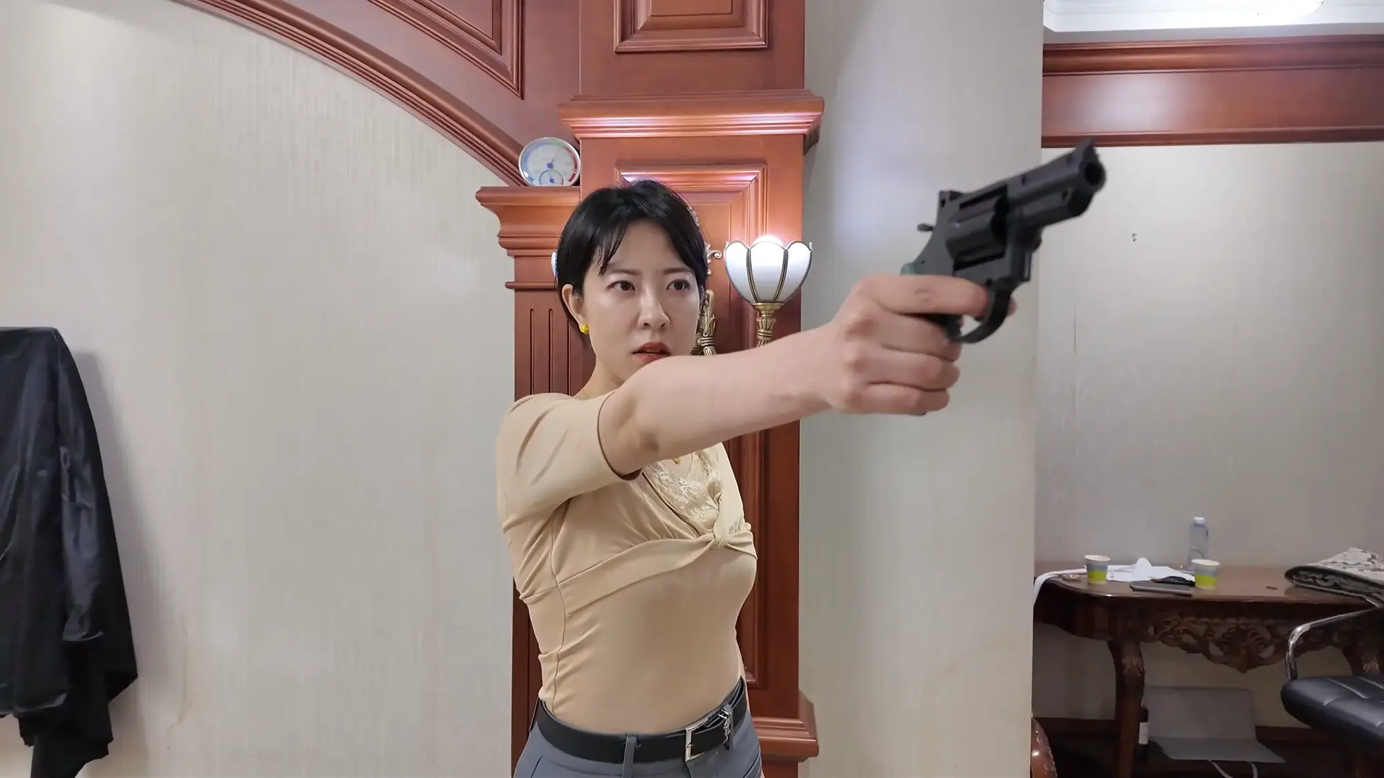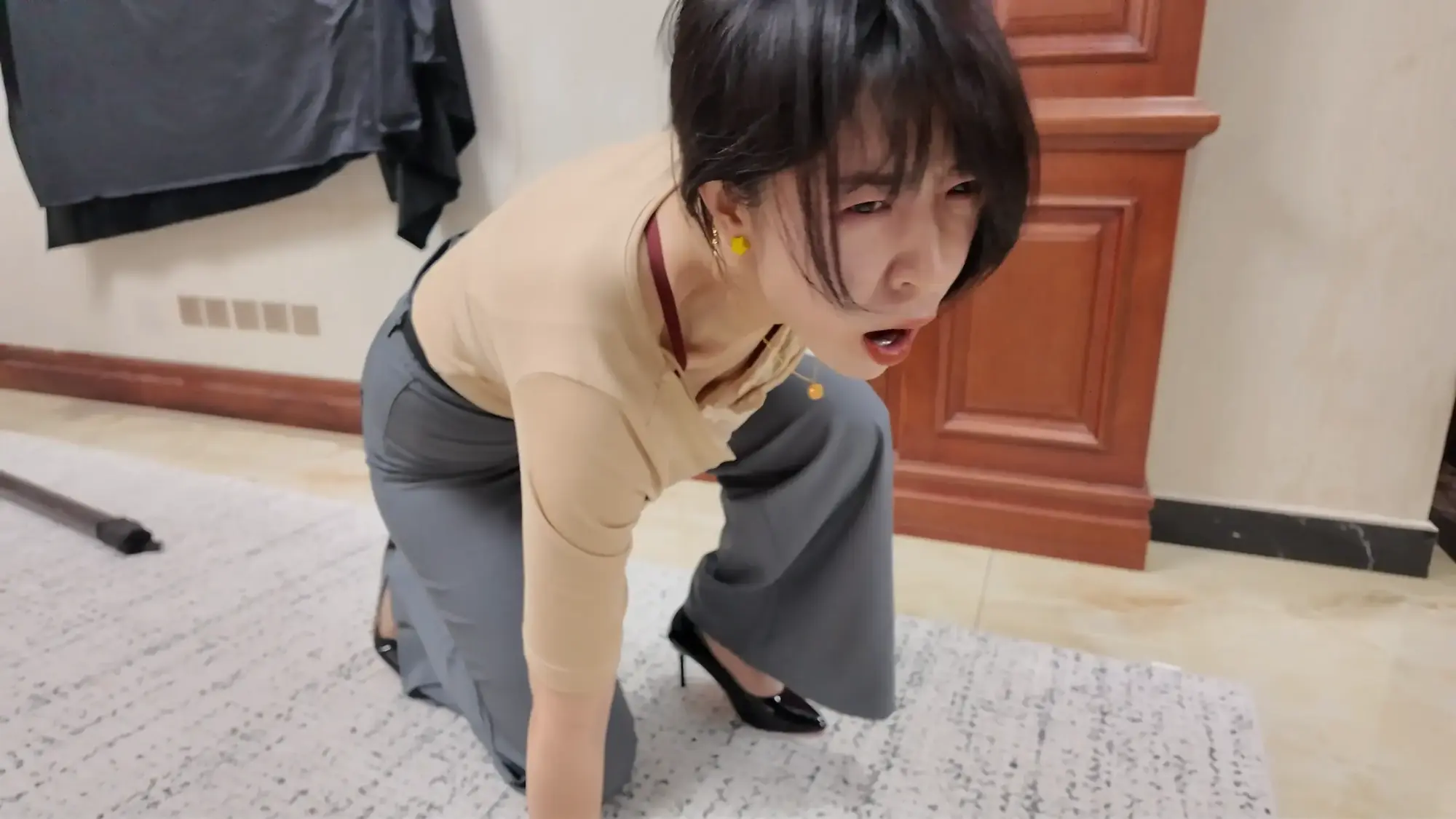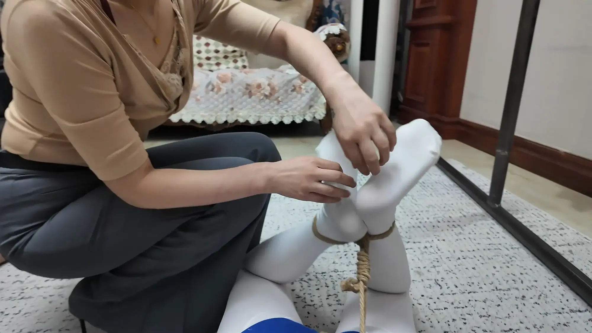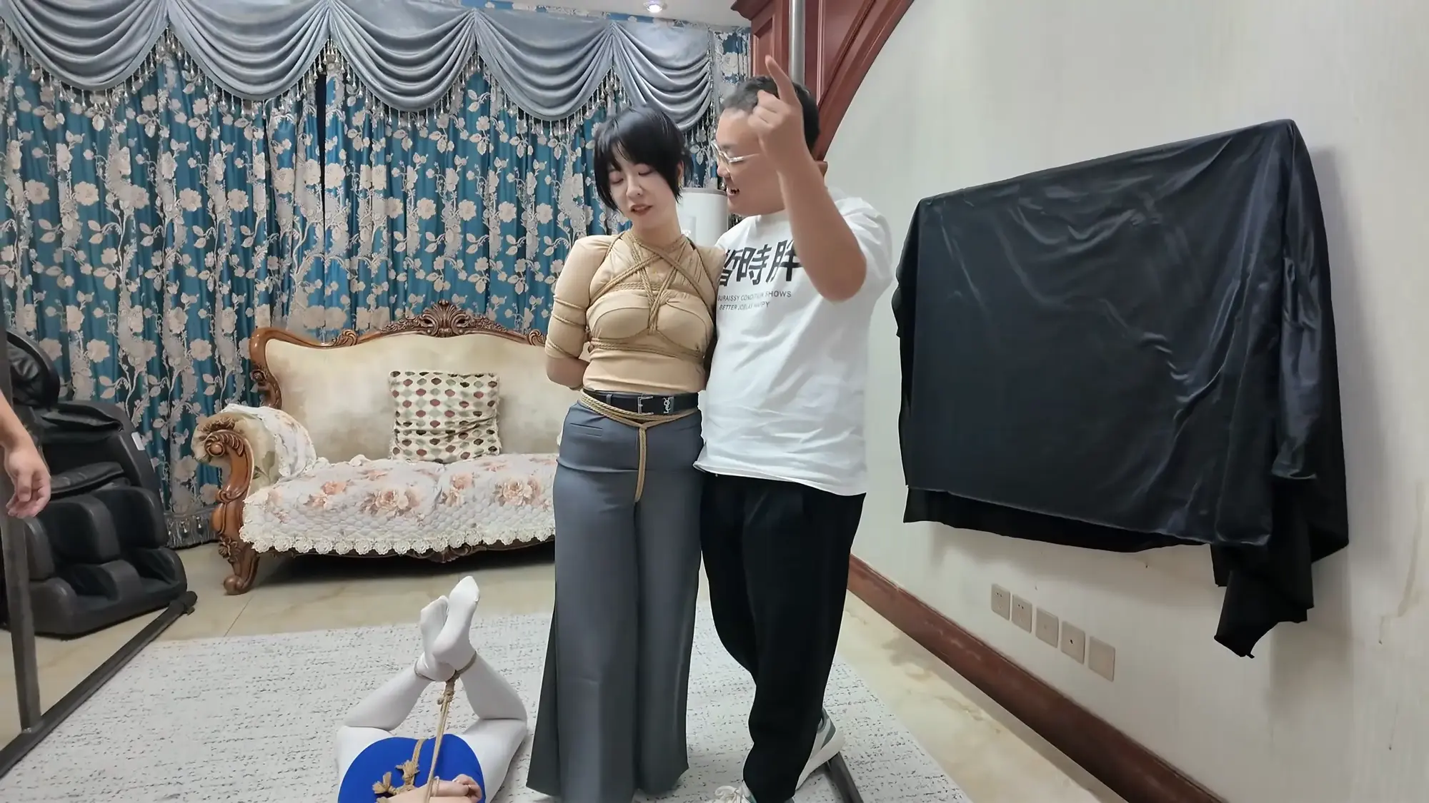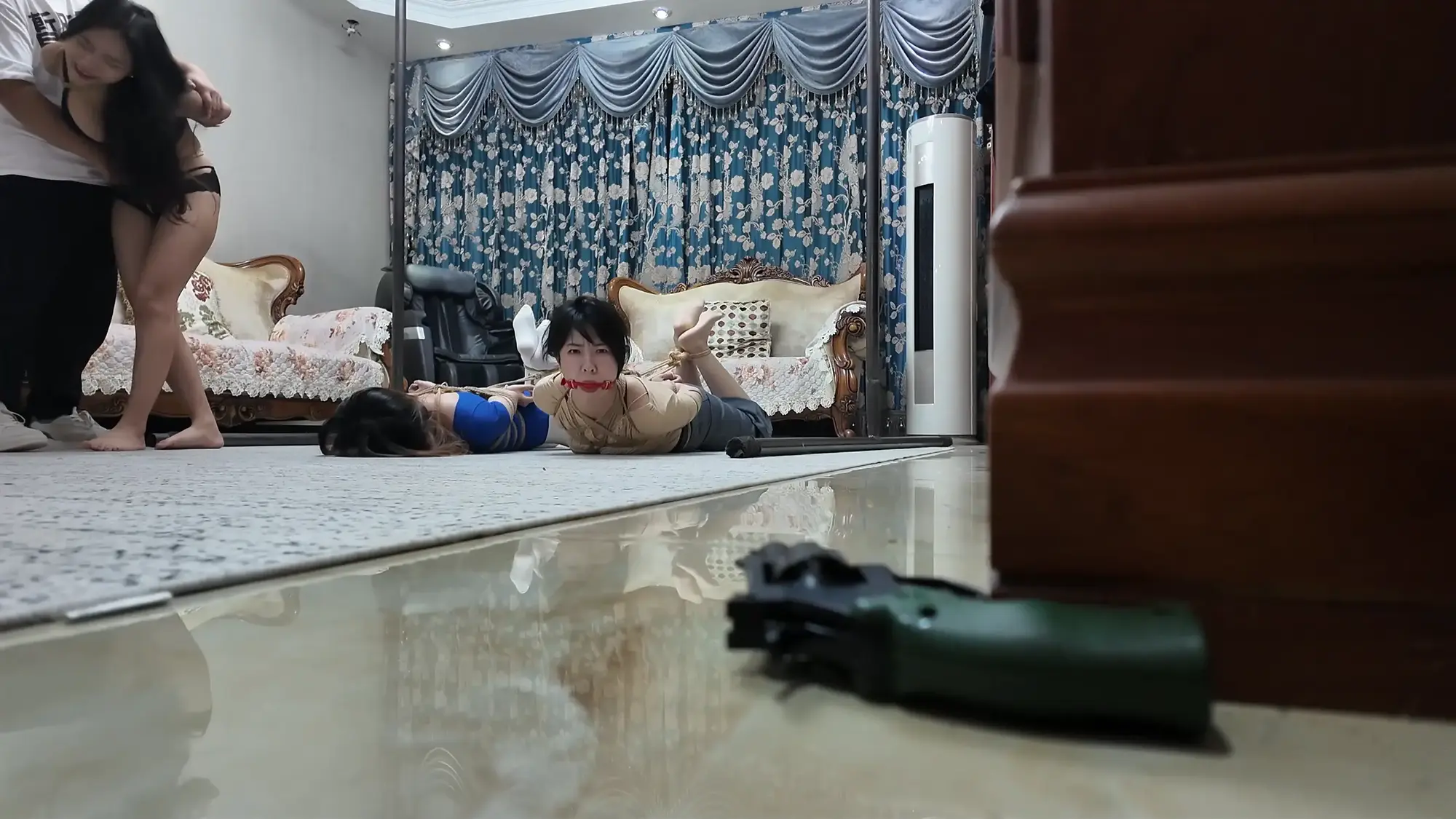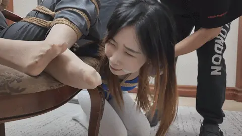画面一转,雷姐被松开绳子,脱去了外衣,大哥用绳子将雷姐后高手紧缚,并将股绳用力绑上,痛得雷姐直叫,大哥见雷姐还是不肯屈服,便开始拉扯雷姐手臂的绳子,由于后高手绑的很紧,雷姐被绳子勒的非常痛,于是求饶,大哥见雷姐示弱,依旧没有停手,又开始恶趣味的拉扯雷姐的股绳,雷姐难受的大叫。于此同时,一旁的e小姐与南清再次被驷马捆绑放置在地上挣扎,e小姐环顾四周,发现了掉落在角落里的手枪,她短暂思考了后暗自窃喜,刻意大笑了起来,大哥甩开雷姐松开了e小姐的口球,质问她为什么笑,雷姐用挑逗的语气表示这么瞎折腾太浪费体力,耽误办正事,大哥乐呵着问e小姐是不是想替雷姐受罪,e小姐回复只要不伤害她,就随他们处置,见e小姐这么顺从大哥兴奋了起来,他站起身一拳将雷姐锤倒,抱起e小姐进了卧室。e小姐躺在床上用脚不停挑逗大哥,失去理智的男人慢慢凑近了e小姐,却不料e小姐突然一头将他撞倒,并顺势用手掐住了他的脖子,男人奋力挣扎还是被杀,e小姐挣脱了束缚缓缓走出卧室,见到小弟还在玩弄雷姐和南清,雷姐与南清看到挣脱束缚的e小姐,不停喊叫,但嘴被口球塞着无法说话,没有察觉的小弟被e小姐从背后扭断了脖子。e小姐开始玩弄两人,她先是抚摸雷姐的大胸,拉扯她的股绳,然后拍打雷姐的屁股,最后去另一边玩弄南清的脚与腿。过了一会儿,e小姐表示自己已经玩够,该带两人上路了,她捡起地上的手枪后突然神情凝重,呵斥躲在角落里的人出来。一位面具人现身,他夸奖了e小姐的本领,几番对话后e小姐得知神秘人是来劫货的,神秘人表示她们三个女人一个也逃不了,e小姐自信的举起枪准备了解了神秘人,却不料神秘人一发石子就将手枪打落,e小姐刚准备捡枪,神秘人已经冲上前一脚踩住,e小姐急忙后退,才发现眼前神秘人实力深不可测,接着神秘人又一发石子击中e小姐的腹部,他向前掐住跪倒在地的e小姐,用绳子将e小姐再次绑了起来。
