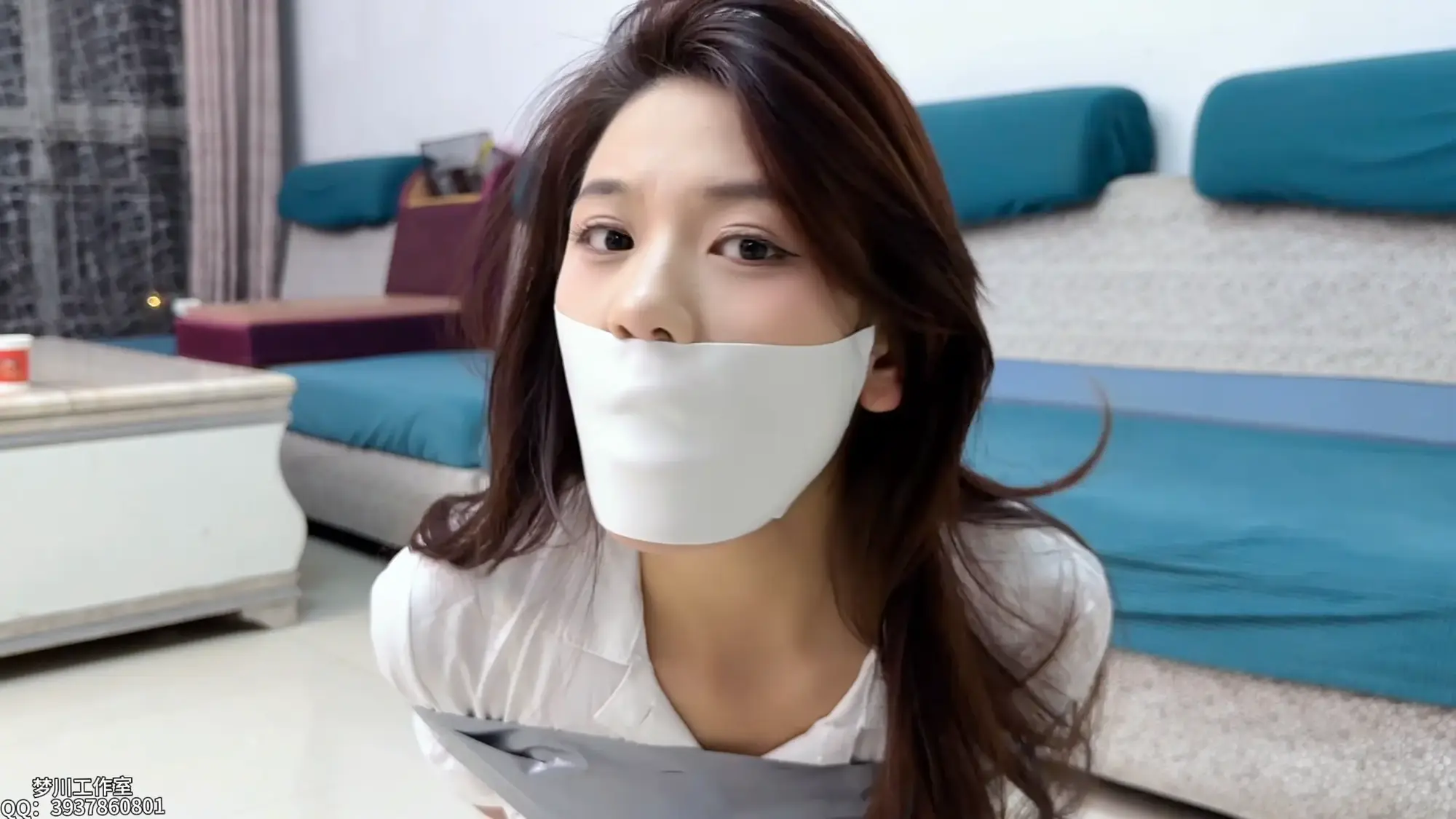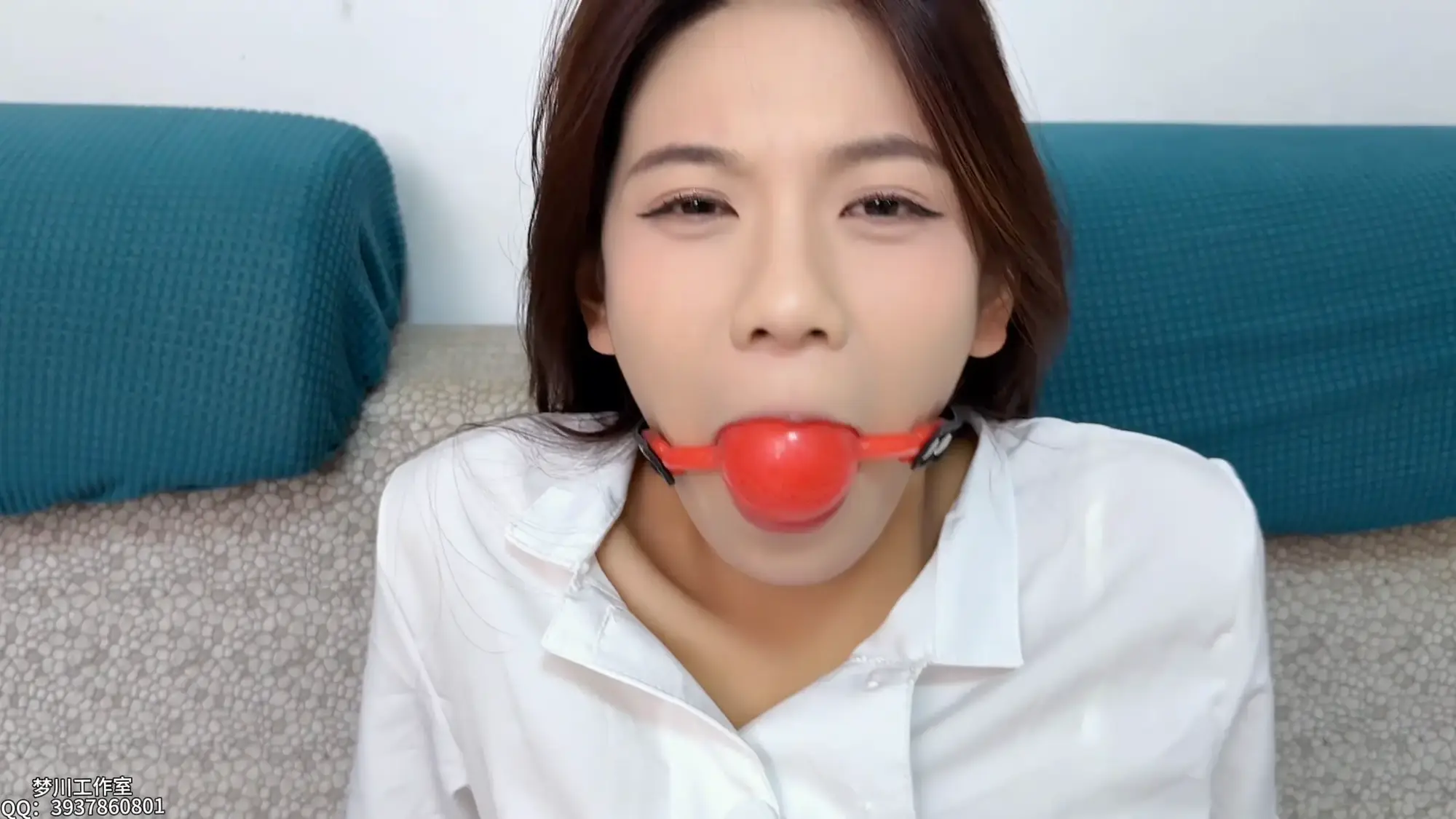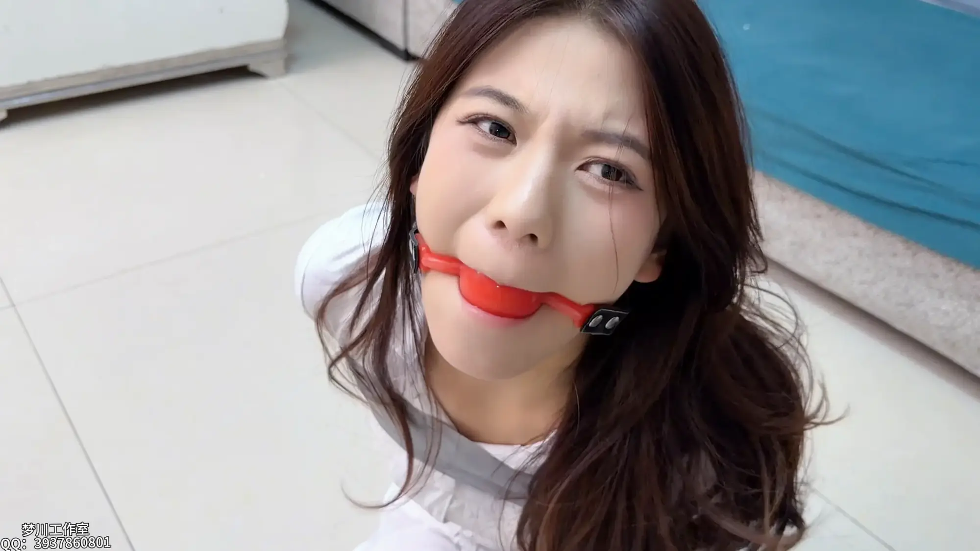 灵儿被重新用胶带捆绑缠绕,口球摘掉之后,