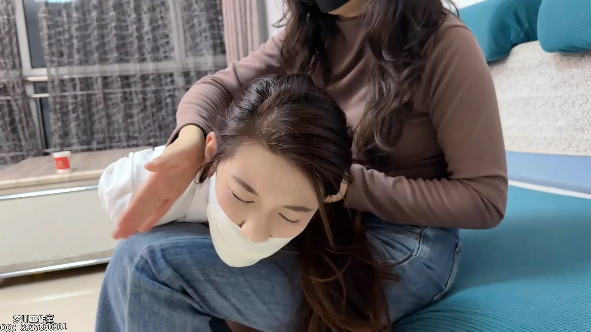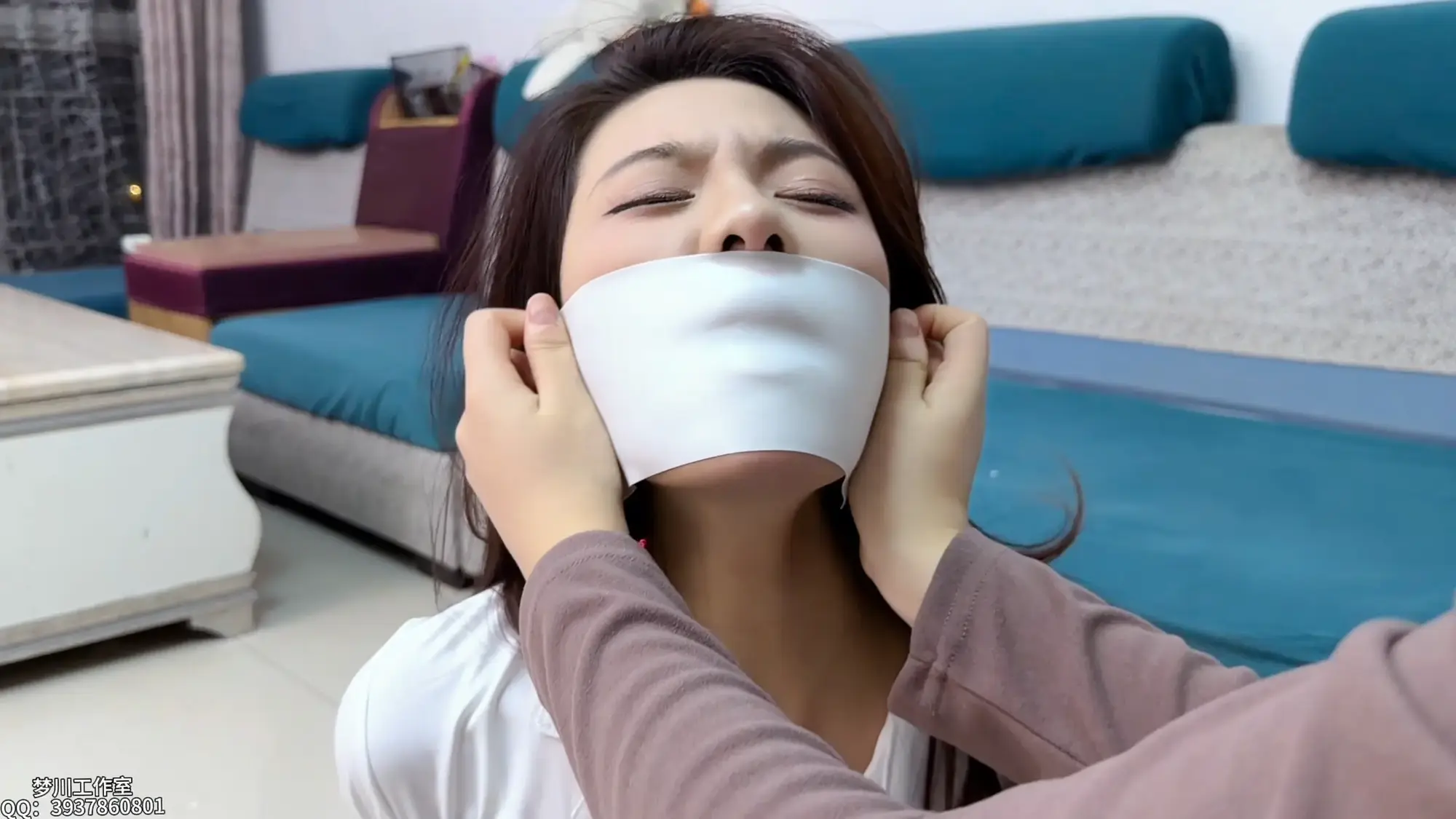 嘴巴在片刻自由后,就被丝袜和医用胶布剥夺了说话的权力!