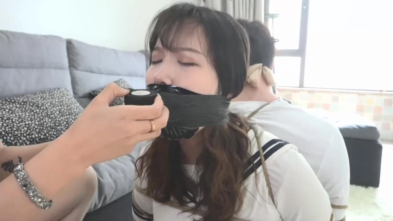 【视频时长】:00:36:16 【文件大小】:995MB 年轻女孩阿妙从昏迷中醒来,惊奇发现自己与男朋友被驷马捆绑在地上,嘴里带着塞口球。 一个身穿黑衣的年轻女子过来,说阿妙与男友偷了公司装机密文件的U盘,黑衣女子解开阿妙二人嘴里口球,可二人推说不知道什么U盘,说是黑衣女子认错人了。 黑衣女匪:还装蒜是吧!给你们点颜色看看!黑衣女匪走向屋内。 阿妙抱怨男友不应该偷公司U盘,男友赶紧让她小声点。这时黑衣女匪回来,把两条肉色连裤丝袜丢到地上,冲阿妙说:这是你这几天穿过脱下来还没洗的丝袜吧? 阿妙和男友不懂对方想干嘛,只见黑衣女匪很快脱掉阿妙和阿妙男友脚上的鞋子,再脱掉二人脚上穿的袜子。 黑衣女匪把阿妙男友脚上穿的臭烘烘的一双黑色锦纶丝袜塞入阿妙口中,把阿妙脚上穿的一双白色锦纶丝袜塞入阿妙男友口中,再分别用两条肉色连裤丝袜勒住情侣二人的嘴巴。 黑衣女匪:既然你们不说,就老老实实吃臭袜子吧!我自己去找! 阿妙与男友互相对视呜呜闷哼抱怨着。 不一会儿,黑衣女匪找到了U盘,原来这U盘放在厕所洗衣机里脏衣服堆低下,黑衣女匪略带嘲讽地说:你们还挺会藏的,让我找这么久,要不是我细心,就被你们给骗过去了!这么捆着不舒服吧,给你们换个舒服点的姿势吧! 黑衣女匪将二人重新捆成背靠背的姿势,坐在客厅沙发前地上。“U盘我就收下了,走之前送你们两口子点礼物。” 黑衣女匪从包里找出一条白色内裤,拽出阿妙口中黑色锦纶丝袜,对阿妙说:这是我穿过的内裤,你看你手绑着,那我只好塞到你嘴里了。于是这条白色内裤被塞入了阿妙的口中。她只能痛苦呜呜闷哼着。黑衣女匪用黑色电工胶布剪下5张,封在阿妙嘴外,再用黑色静电胶带沿她脑后缠绕5圈,再拿黑色自粘绷带缠绕5圈。 黑衣女匪走到阿妙男友身边,脱掉脚上鞋子,脱掉腿上穿的一条肉色连裤丝袜,对阿妙男友说:“帅哥,这是我穿了好几天的袜子,就当做纪念,送给你了。”不顾阿妙男友摇头,黑衣女匪拽出他口中白色锦纶丝袜丢掉,把这条原味肉色连裤丝袜塞入阿妙男友口中,同样用黑色电工胶布、黑色静电胶带、黑色自粘绷带缠绕封嘴。 黑衣女匪给情侣二人拍了几张照片,还羞辱对方,阿妙与男友愤怒地瞪向黑衣女匪,黑衣女匪:“还敢瞪我?!”她用黑色静电胶带与黑色自粘绷带,分别沿情侣二人眼睛外缠绕,封住二人眼睛。 “好好享受吧,拜拜!”黑衣女匪离开了,留下情侣二人扭动身体剧烈挣扎着,一番挣扎后二人终于挣脱捆绑,解除封眼与塞嘴,拽出口中内裤与袜子大口喘气,思考如何对黑衣女匪进行报复。 看点:情侣捆绑(真实情侣出演)、女劫匪、二次捆绑塞嘴、原味丝袜交换塞嘴、胶布绷带多重缠绕封嘴、胶布绷带封眼、挣脱解除塞嘴封堵。 ![]() ![]() ![]() ![]() ![]() ![]() ![]() ![]() ![]() ![]() ![]() ![]() ![]() ![]() ![]() ![]() ![]() ![]() ![]() ![]() ![]() ![]() ![]() ![]() ![]() ![]() ![]() ![]() ![]() ![]()